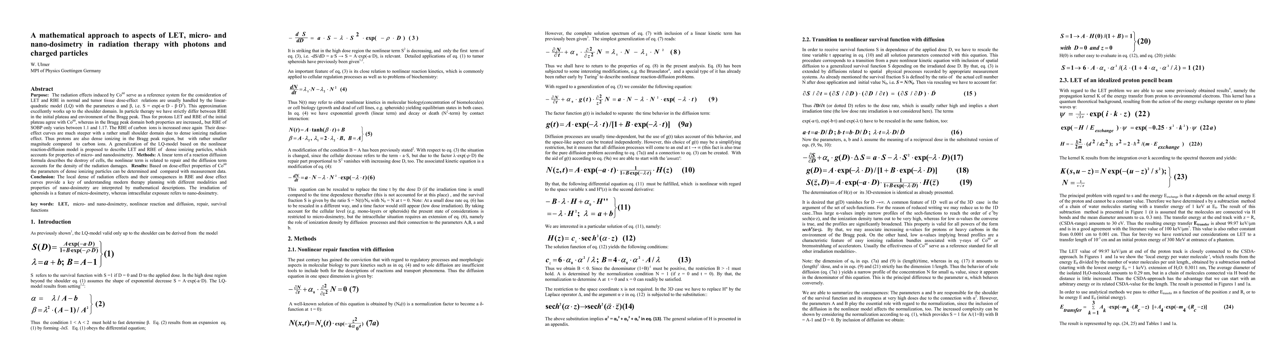 The radiation effects induced by Co60 serve as a reference system for the consideration of LET and RBE in normal and tumor tissue dose-effect relations are usually handled by the linear-quadratic model (LQ). This approximation excellently works up to the shoulder domain. In particle therapy we have strictly differ between RBE in the initial plateau and environment of the Bragg peak. Thus for protons LET and RBE of the initial plateau agree with Co60, whereas in the Bragg peak domain both properties are increased,, but RBE of SOBP only varies between 1.1 and 1.17. The RBE of carbon ions is increased once again Their dose-effect curves are much steeper with a rather small shoulder domain due to dense ionizing radiation effect. Thus protons are also dense ionizing in the Bragg peak region, but with rather smaller magnitude compared to carbon ions. A generalization of the LQ-model based on the nonlinear reaction-diffusion model is proposed to describe LET and RBE of dense ionizing particles, which accounts for properties of micro- and nano-dosimetry. A linear term of a reaction diffusion formula describes the destroy of cells, the nonlinear term is related to repair and the diffusion term accounts for the density of the radiation damages. Based on dose-effect properties of Co60 the parameters of dense ionizing particles can be determined and compared with measurement data. The local dense of radiation effects and their consequences in RBE and dose effect curves provide a key of understanding modern therapy planning with different modalities and properties of nano-dosimetry are interpreted by mathematical descriptions. The irradiation of spheroids is a feature of micro-dosimetry, whereas intracellular exposure refers to nano-dosimetry.