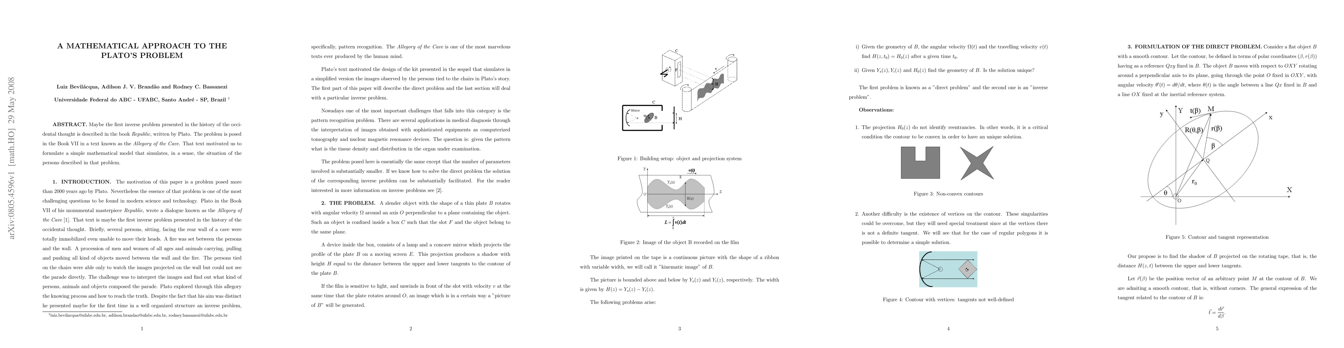 Maybe the first inverse problem presented in the history of the occidental thought is described in the book Republic, written by Plato. The problem is posed in the Book VII in a text known as the Allegory of the Cave. That text motivated us to formulate a simple mathematical model that simulates, in a sense, the situation of the persons described in that problem.