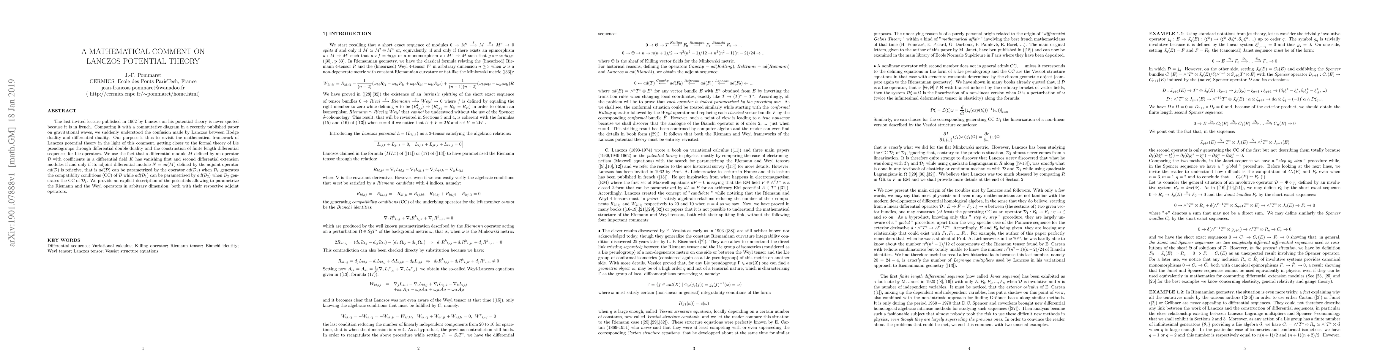 The last invited lecture published in $1962$ by Lanczos on his potential theory is never quoted because it is in french. Comparing it with a commutative diagram in a recently published paper on gravitational waves, we suddenly understood the confusion made by Lanczos between Hodge duality and differential duality. Our purpose is thus to revisit the mathematical framework of Lanczos potential theory in the light of this comment, getting closer to the formal theory of Lie pseudogroups through differential double duality and the construction of finite length differential sequences for Lie operators. We use the fact that a differential module $M$ defined by an operator ${\cal{D}}$ with coefficients in a differential field $K$ has vanishing first and second differential extension modules if and only if its adjoint differential module $N=ad(M)$ defined by the adjoint operator $ad({\cal{D}})$ is reflexive, that is $ad({\cal{D}})$ can be parametrized by the operator $ad({\cal{D}}_1)$ when ${\cal{D}}_1$ generates the compatibilty conditions (CC) of ${\cal{D}}$ while $ad({\cal{D}}_1)$ can be parametrized by $ad({\cal{D}}_2)$ when ${\cal{D}}_2$ generates the CC of ${\cal{D}}_1$. We provide an explicit description of the potentials allowing to parametrize the Riemann and the Weyl operators in arbitrary dimension, both with their respective adjoint operators.