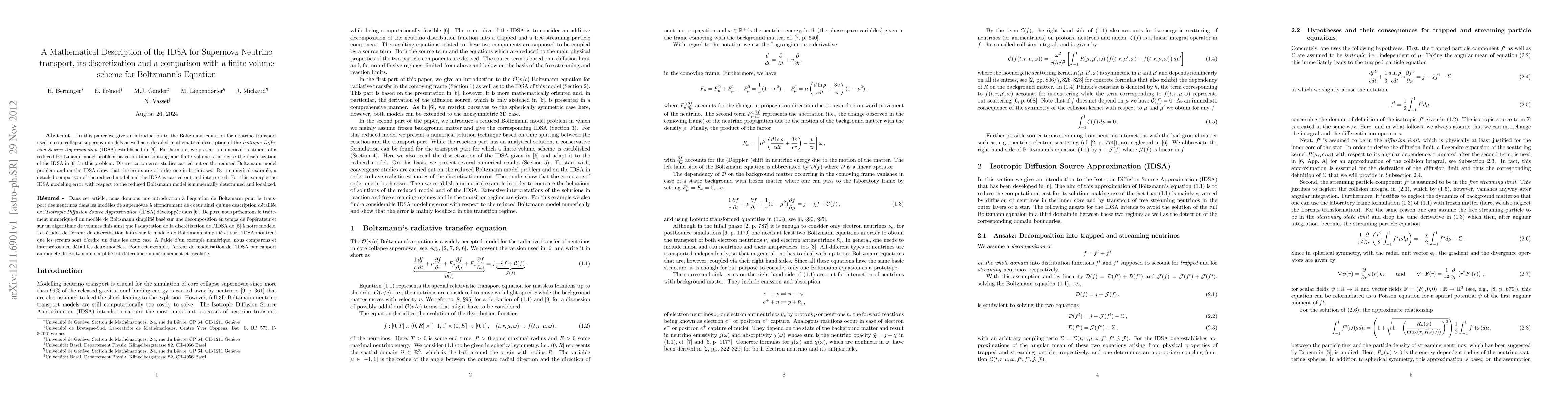 This paper introduces the Boltzmann equation for neutrino transport in supernova models and provides a detailed mathematical description of the Isotropic Diffusion Source Approximation (IDSA). It also compares the IDSA with a finite volume scheme for Boltzmann's equation, showing both discretization errors are of order one, and conducts a numerical comparison to determine the IDSA modeling error.
