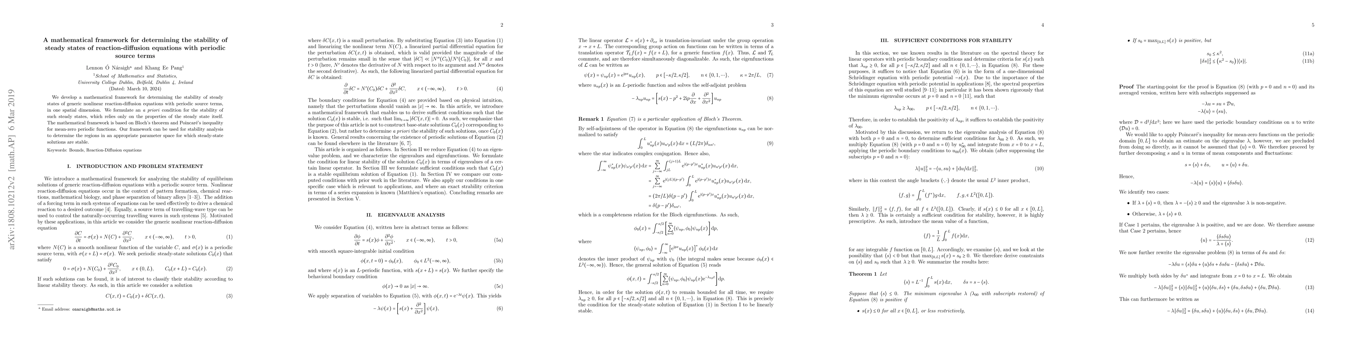 This paper develops a mathematical framework to determine the stability of steady states in reaction-diffusion equations with periodic sources, using Bloch's theorem and Poincaré's inequality. It establishes an a priori stability condition based on the properties of the steady state itself, applicable in one spatial dimension.