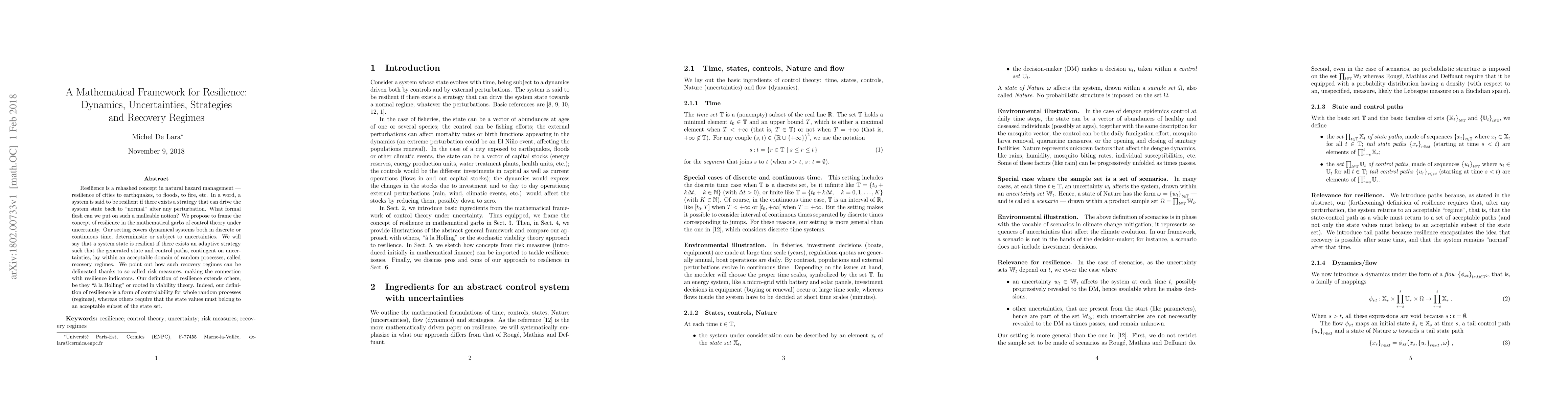 Resilience is a rehashed concept in natural hazard management - resilience of cities to earthquakes, to floods, to fire, etc. In a word, a system is said to be resilient if there exists a strategy that can drive the system state back to "normal" after any perturbation. What formal flesh can we put on such a malleable notion? We propose to frame the concept of resilience in the mathematical garbs of control theory under uncertainty. Our setting covers dynamical systems both in discrete or continuous time, deterministic or subject to uncertainties. We will say that a system state is resilient if there exists an adaptive strategy such that the generated state and control paths, contingent on uncertainties, lay within an acceptable domain of random processes, called recovery regimes. We point out how such recovery regimes can be delineated thanks to so called risk measures, making the connection with resilience indicators. Our definition of resilience extends others, be they "` a la Holling" or rooted in viability theory. Indeed, our definition of resilience is a form of controlability for whole random processes (regimes), whereas others require that the state values must belong to an acceptable subset of the state set.