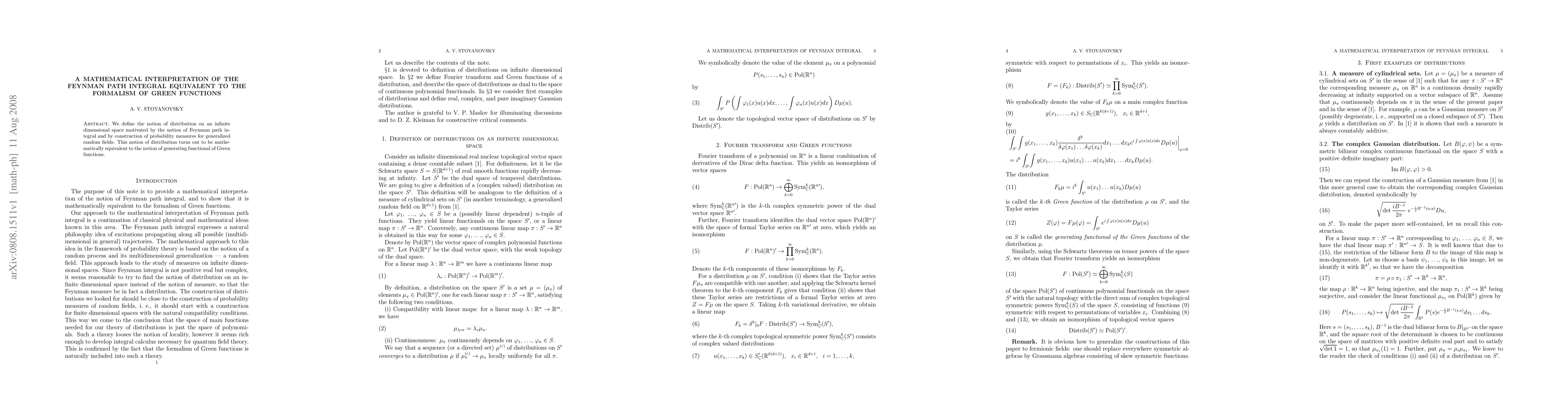 We define the notion of distribution on an infinite dimensional space motivated by the notion of Feynman path integral and by construction of probability measures for generalized random fields. This notion of distribution turns out to be mathematically equivalent to the notion of generating functional of Green functions.