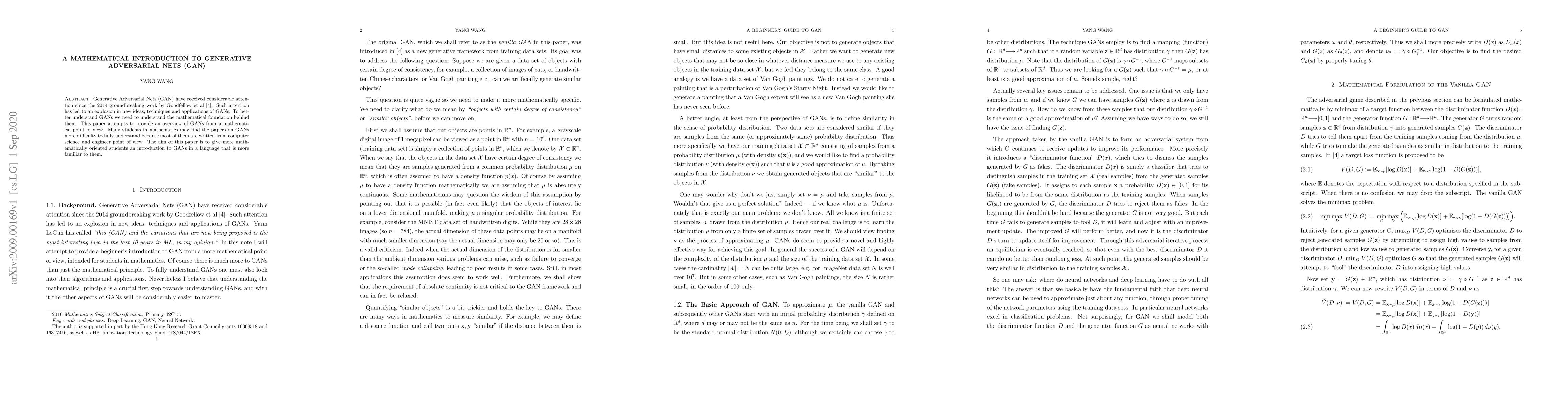 This paper offers a mathematical introduction to Generative Adversarial Nets (GANs), aiming to bridge the gap for mathematically inclined students who find computer science-oriented papers challenging. It provides a foundational overview of GANs, emphasizing their mathematical underpinnings.
