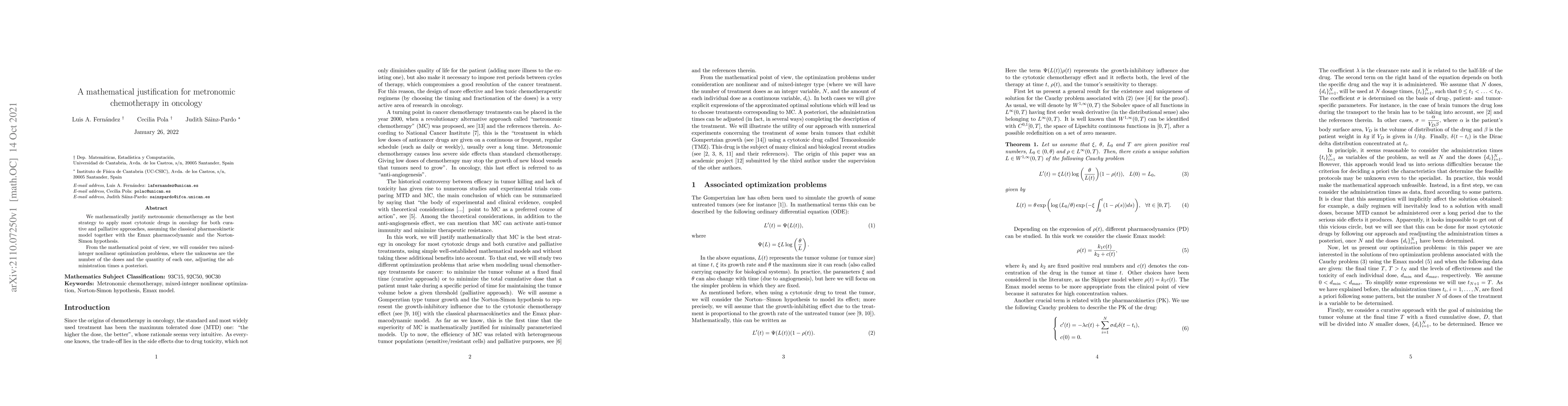 This paper mathematically justifies metronomic chemotherapy as an optimal strategy for both curative and palliative cancer treatments, using pharmacokinetic, pharmacodynamic, and Norton-Simon hypothesis models. It formulates two mixed-integer nonlinear optimization problems to determine the optimal number and quantity of doses.