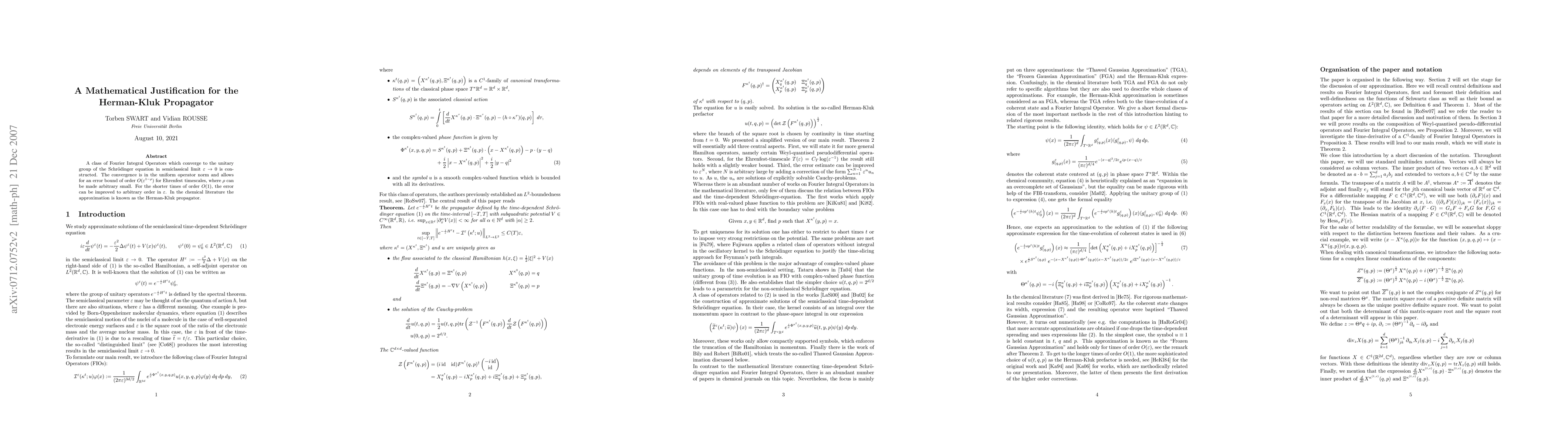 This paper constructs a class of Fourier Integral Operators that converge to the unitary group of the Schrödinger equation in the semiclassical limit, providing an error bound of $O(\eps^{1-\rho})$ for Ehrenfest timescales. For shorter times, the error can be improved to any order in $\eps$, formalizing the Herman-Kluk propagator.