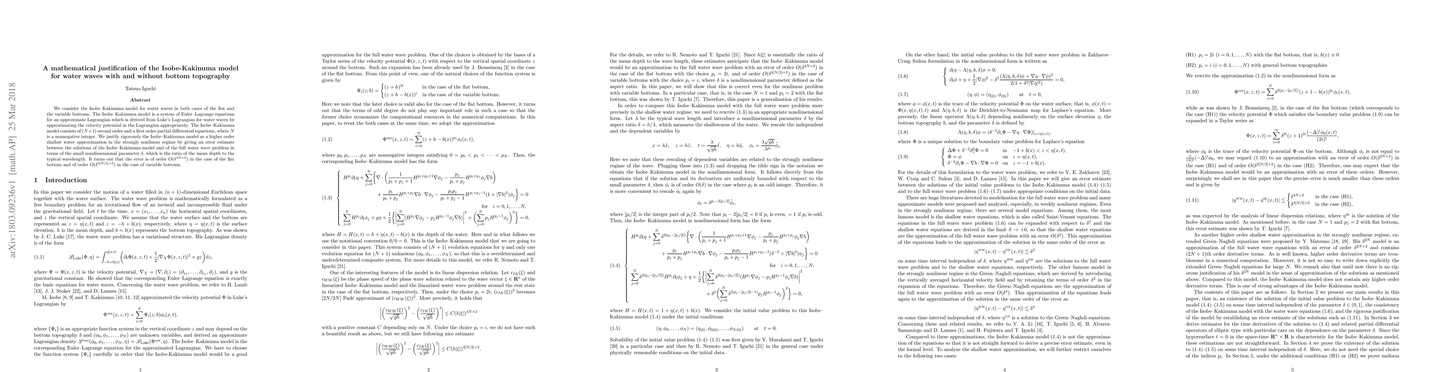 This paper rigorously justifies the Isobe-Kakinuma model for water waves, showing it as a higher-order approximation for both flat and variable bottoms. The error estimates reveal that the model's accuracy is $O(\delta^{4N+2})$ for flat bottoms and $O(\delta^{4[N/2]+2})$ for variable bottoms.
