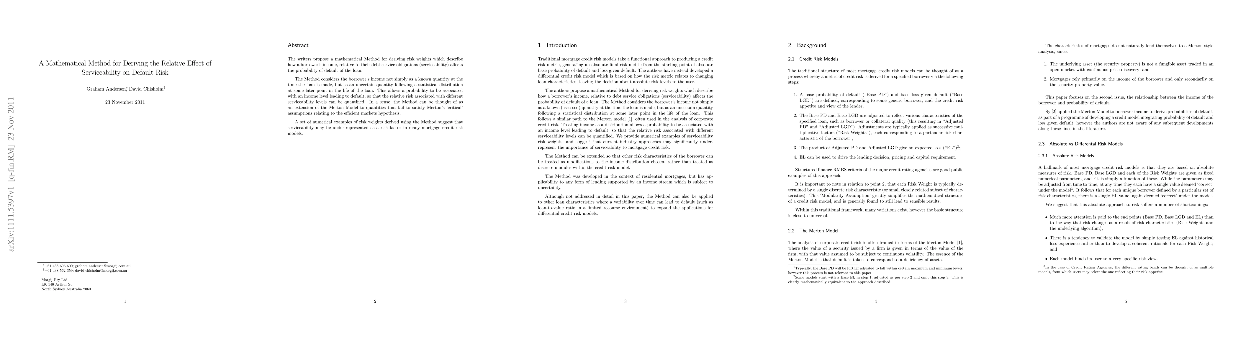 The writers propose a mathematical Method for deriving risk weights which describe how a borrower's income, relative to their debt service obligations (serviceability) affects the probability of default of the loan. The Method considers the borrower's income not simply as a known quantity at the time the loan is made, but as an uncertain quantity following a statistical distribution at some later point in the life of the loan. This allows a probability to be associated with an income level leading to default, so that the relative risk associated with different serviceability levels can be quantified. In a sense, the Method can be thought of as an extension of the Merton Model to quantities that fail to satisfy Merton's 'critical' assumptions relating to the efficient markets hypothesis. A set of numerical examples of risk weights derived using the Method suggest that serviceability may be under-represented as a risk factor in many mortgage credit risk models.