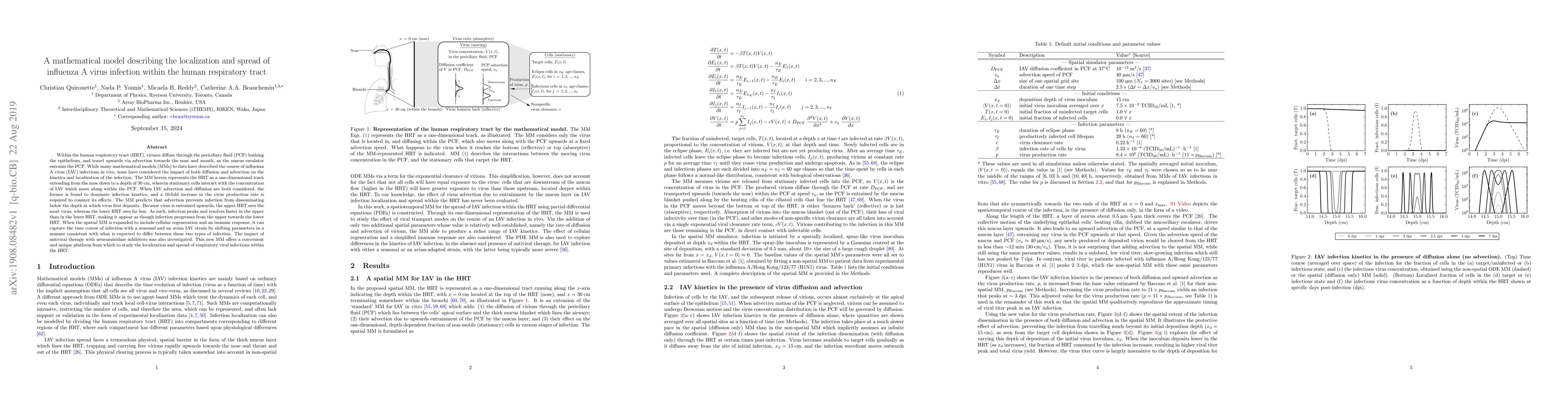 This paper presents a mathematical model that describes the diffusion and advection of influenza A virus within the human respiratory tract, showing that advection dominates infection kinetics. The model predicts that infection peaks and resolves faster in the upper respiratory tract due to virus being entrained upwards, and it can capture the infection time course of different strains by adjusting parameters.