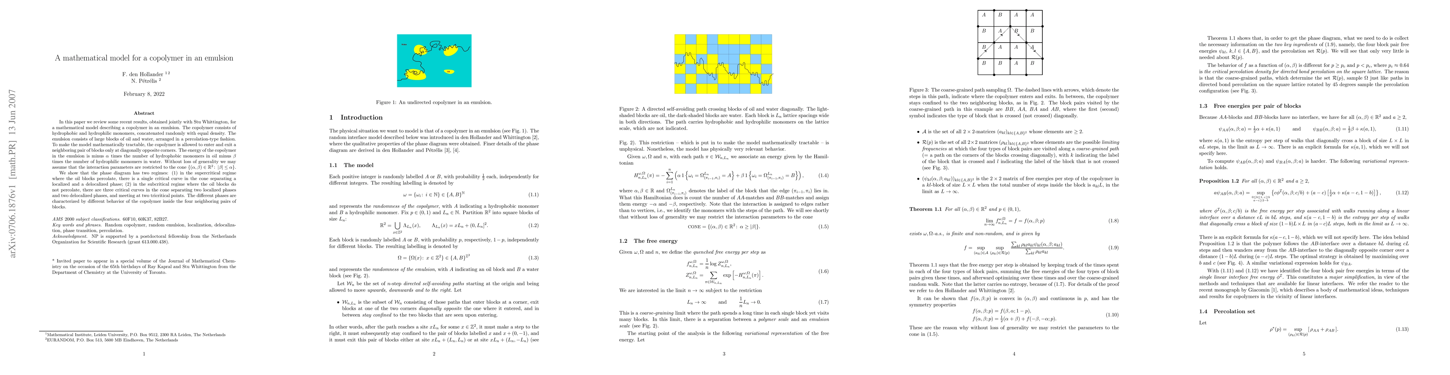 A mathematical model simulates copolymer behavior in an emulsion, revealing two regimes: supercritical with a single critical curve separating localized and delocalized phases, and subcritical with three critical curves and tricritical points.