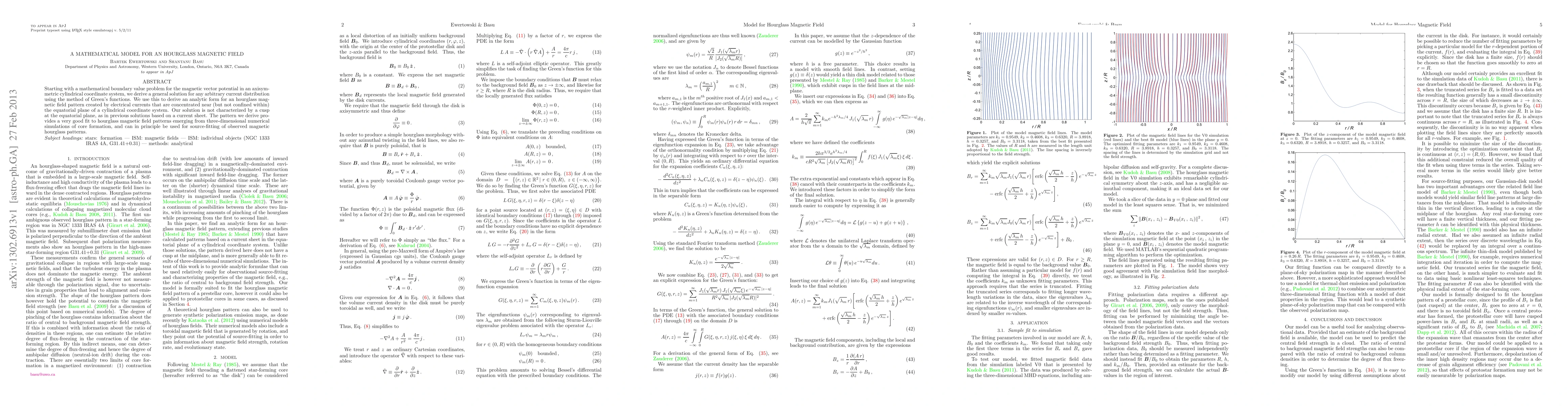 Starting with a mathematical boundary value problem for the magnetic vector potential in an axisymmetric cylindrical coordinate system, we derive a general solution for any arbitrary current distribution using the method of Green's functions. We use this to derive an analytic form for an hourglass magnetic field pattern created by electrical currents that are concentrated near (but not confined within) the equatorial plane of a cylindrical coordinate system. Our solution is not characterized by a cusp at the equatorial plane, as in previous solutions based on a current sheet. The pattern we derive provides a very good fit to hourglass magnetic field patterns emerging from three-dimensional numerical simulations of core formation, and can in principle be used for source-fitting of observed magnetic hourglass patterns.