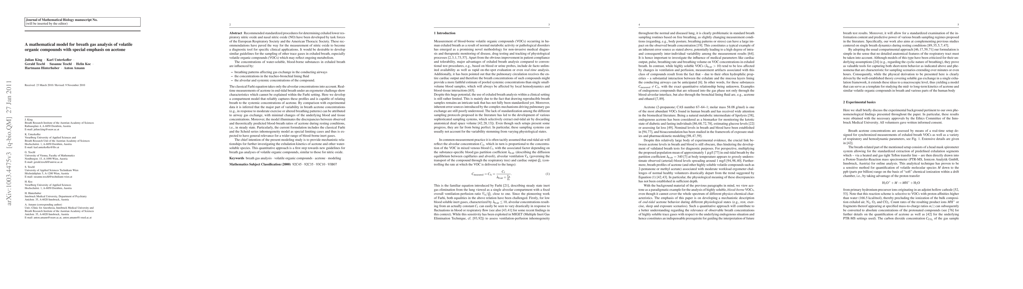 This paper develops a mathematical model for analyzing breath gas concentrations of volatile organic compounds, with a focus on acetone. It proposes a compartment model that better explains real-time acetone measurements during exercise compared to the classical Farhi equation, highlighting the role of airway gas exchange in variability.
