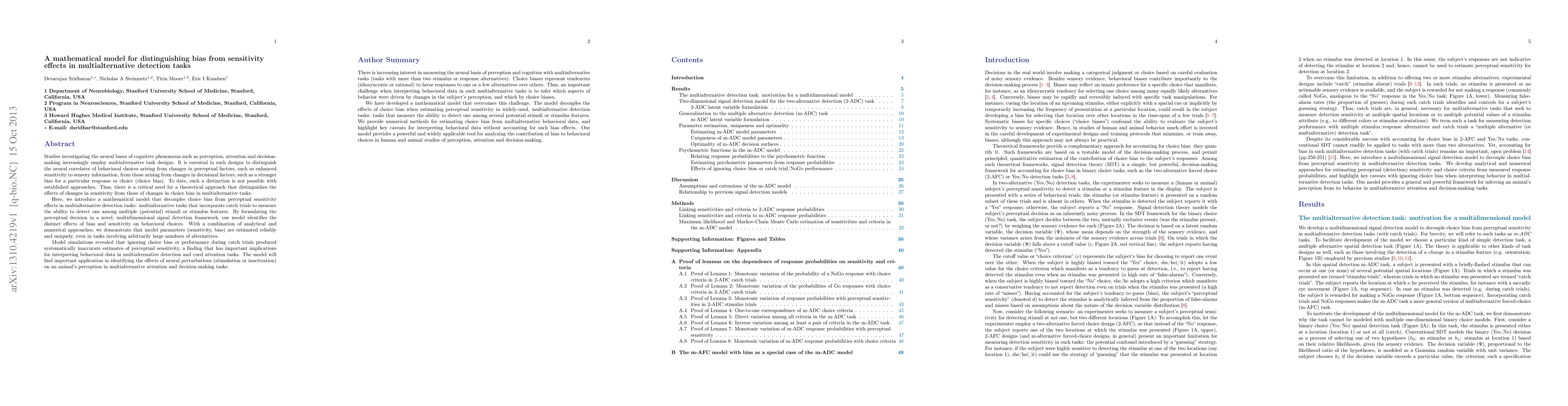 This paper introduces a mathematical model to distinguish between perceptual sensitivity and decisional bias in multialternative detection tasks. The model, formulated in a multidimensional signal detection framework, reliably estimates both parameters, even with many alternatives, and highlights the importance of considering choice bias and performance in catch trials to accurately assess perceptual sensitivity.