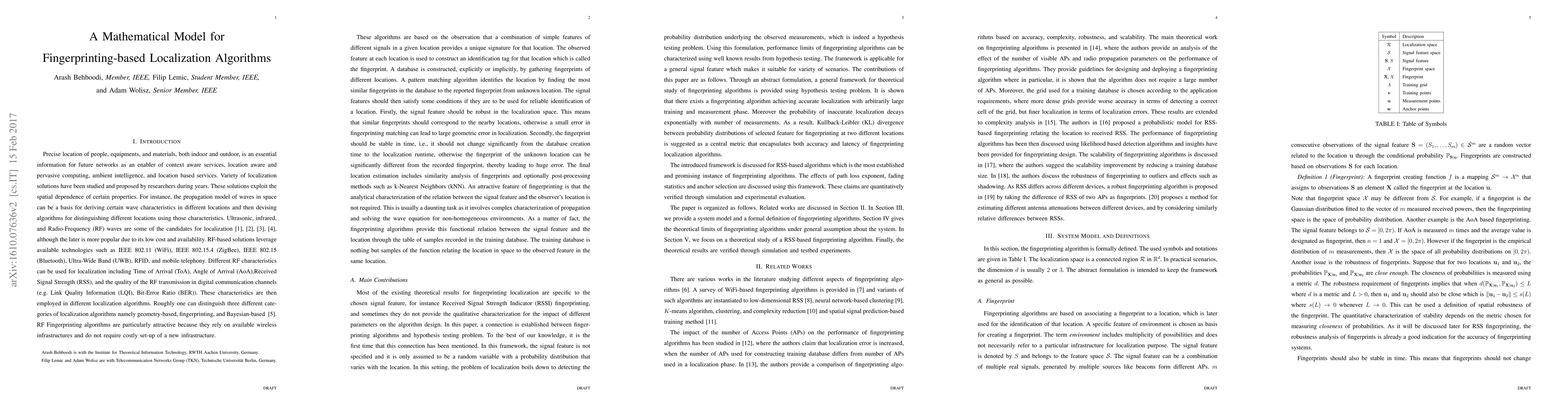 A general theoretical framework for Fingerprinting Localization Algorithms (FPS), given their popularity, can be utilized for their performance studies. In this work, after setting up an abstract model for FPS, it is shown that fingerprinting-based localization problem can be cast as a hypothesis testing (HT) problem and therefore various results in HT literature can be used to provide insights, guidelines and performance bounds for general FPS. This framework results in characterization of scaling limits of localization reliability in terms of number of measurements and other environmental parameters. It is suggested that Kullback-Leibler (KL) divergence between probability distributions of selected feature for fingerprinting at different locations encapsulates information about both accuracy and latency and can be used as a central performance metric for studying FPS. Although developed for an arbitrary fingerprint, the framework is particularly used for studying simple Received Signal Strength (RSS)- based algorithm. The effect of various parameters on the performance of fingerprinting algorithms is discussed, which includes path loss and fading characteristics, number of measurements at each point, number of anchors and their position, and placement of training points. Representative simulations and experimentation are used to verify validity of the theoretical frameworks in realistic setups.