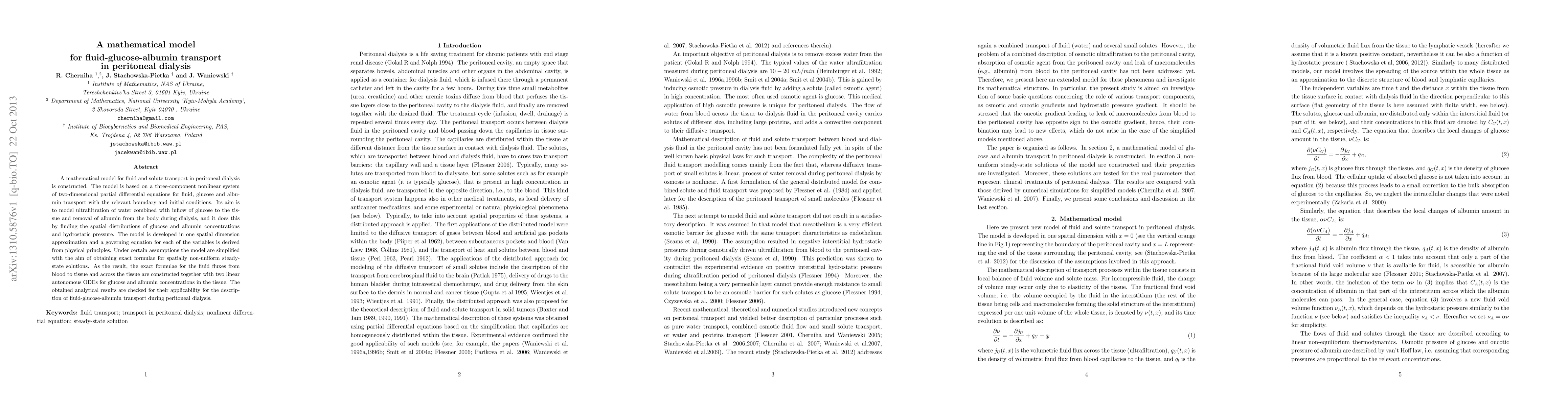 This paper constructs a mathematical model for fluid, glucose, and albumin transport during peritoneal dialysis using a three-component nonlinear system of partial differential equations. The model aims to describe ultrafiltration, glucose inflow, and albumin removal, yielding exact formulae for steady-state solutions and linear ODEs for glucose and albumin concentrations.