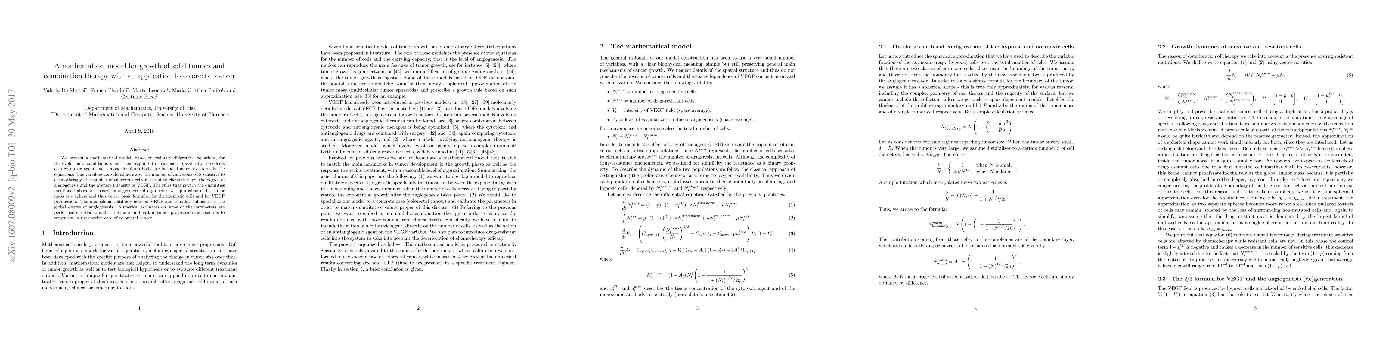 This paper introduces a mathematical model using ordinary differential equations to simulate the growth of solid tumors and their response to combination therapy, focusing on colorectal cancer. The model incorporates variables for sensitive and resistant cancerous cells, angiogenesis, and VEGF intensity, with an emphasis on the effects of cytotoxic agents and monoclonal antibodies.