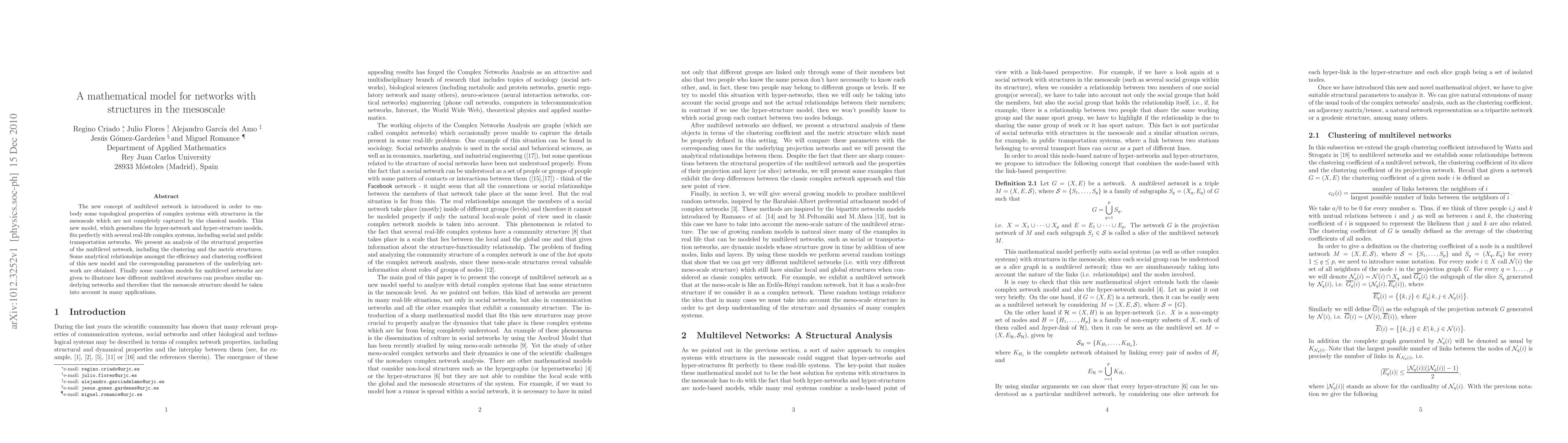 The new concept of multilevel network is introduced in order to embody some topological properties of complex systems with structures in the mesoscale which are not completely captured by the classical models. This new model, which generalizes the hyper-network and hyper-structure models, fits perfectly with several real-life complex systems, including social and public transportation networks. We present an analysis of the structural properties of the multilevel network, including the clustering and the metric structures. Some analytical relationships amongst the efficiency and clustering coefficient of this new model and the corresponding parameters of the underlying network are obtained. Finally some random models for multilevel networks are given to illustrate how different multilevel structures can produce similar underlying networks and therefore that the mesoscale structure should be taken into account in many applications.