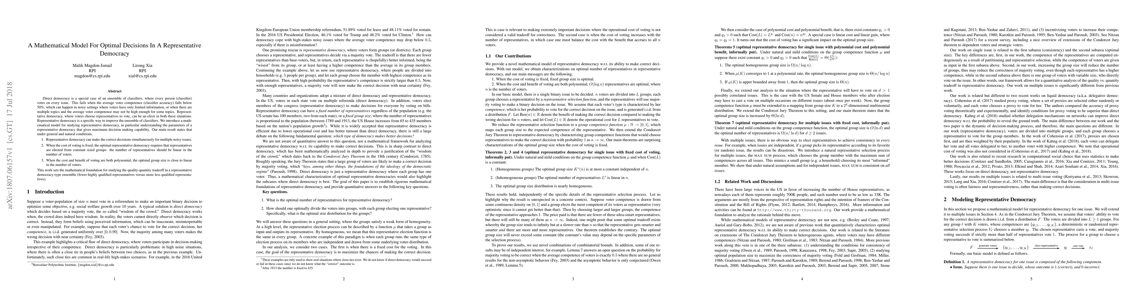 Direct democracy is a special case of an ensemble of classifiers, where every person (classifier) votes on every issue. This fails when the average voter competence (classifier accuracy) falls below 50%, which can happen in noisy settings where voters have only limited information, or when there are multiple topics and the average voter competence may not be high enough for some topics. Representative democracy, where voters choose representatives to vote, can be an elixir in both these situations. Representative democracy is a specific way to improve the ensemble of classifiers. We introduce a mathematical model for studying representative democracy, in particular understanding the parameters of a representative democracy that gives maximum decision making capability. Our main result states that under general and natural conditions, 1. Representative democracy can make the correct decisions simultaneously for multiple noisy issues. 2. When the cost of voting is fixed, the optimal representative democracy requires that representatives are elected from constant sized groups: the number of representatives should be linear in the number of voters. 3. When the cost and benefit of voting are both polynomial, the optimal group size is close to linear in the number of voters. This work sets the mathematical foundation for studying the quality-quantity tradeoff in a representative democracy-type ensemble (fewer highly qualified representatives versus more less qualified representatives).