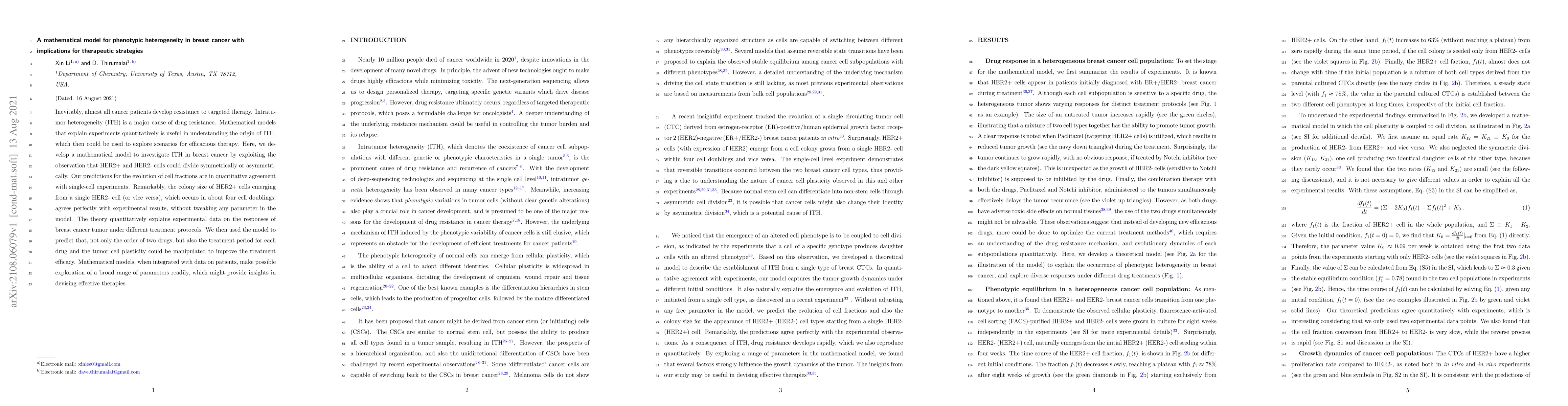 Inevitably, almost all cancer patients develop resistance to targeted therapy. Intratumor heterogeneity (ITH) is a major cause of drug resistance. Mathematical models that explain experiments quantitatively is useful in understanding the origin of ITH, which then could be used to explore scenarios for efficacious therapy. Here, we develop a mathematical model to investigate ITH in breast cancer by exploiting the observation that HER2+ and HER2- cells could divide symmetrically or asymmetrically. Our predictions for the evolution of cell fractions are in quantitative agreement with single-cell experiments. Remarkably, the colony size of HER2+ cells emerging from a single HER2- cell (or vice versa), which occurs in about four cell doublings, agrees perfectly with experimental results, without tweaking any parameter in the model. The theory quantitatively explains experimental data on the responses of breast cancer tumor under different treatment protocols. We then used the model to predict that, not only the order of two drugs, but also the treatment period for each drug and the tumor cell plasticity could be manipulated to improve the treatment efficacy. Mathematical models, when integrated with data on patients, make possible exploration of a broad range of parameters readily, which might provide insights in devising effective therapies.