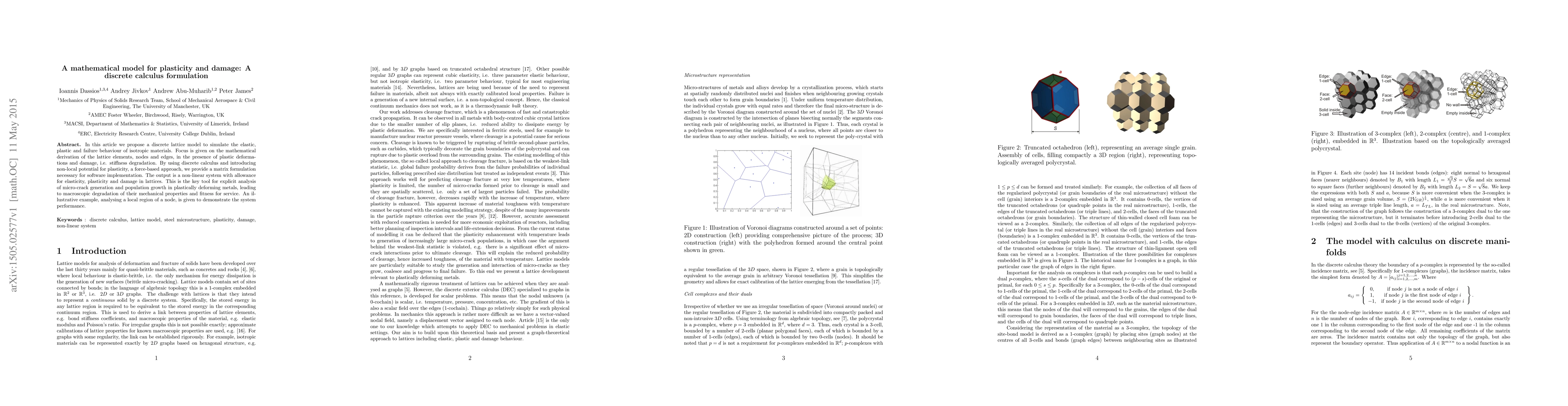 In this article we propose a discrete lattice model to simulate the elastic, plastic and failure behaviour of isotropic materials. Focus is given on the mathematical derivation of the lattice elements, nodes and edges, in the presence of plastic deformations and damage, i.e. stiffness degradation. By using discrete calculus and introducing non-local potential for plasticity, a force-based approach, we provide a matrix formulation necessary for software implementation. The output is a non-linear system with allowance for elasticity, plasticity and damage in lattices. This is the key tool for explicit analysis of micro-crack generation and population growth in plastically deforming metals, leading to macroscopic degradation of their mechanical properties and fitness for service. An illustrative example, analysing a local region of a node, is given to demonstrate the system performance.