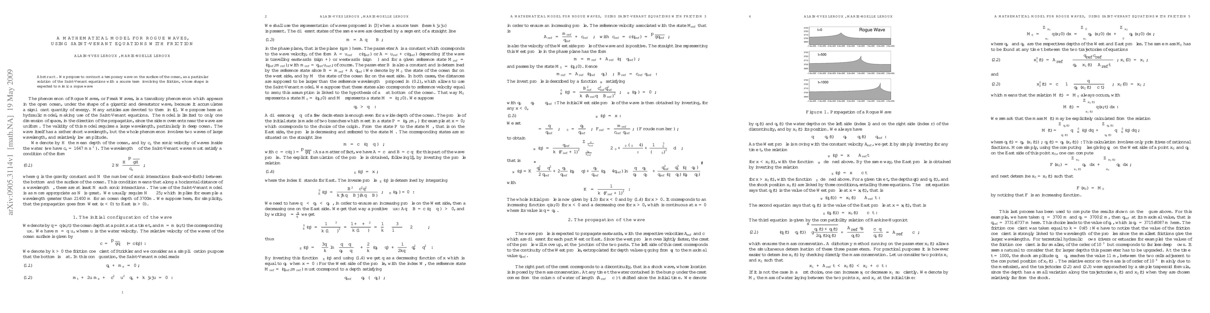 Summary: This paper proposes a mathematical model for rogue waves based on the Saint-Venant equations incorporating friction, aiming to construct a temporary ocean surface wave that mimics the characteristics of rogue waves. The model includes a source term that accounts for frictional effects.