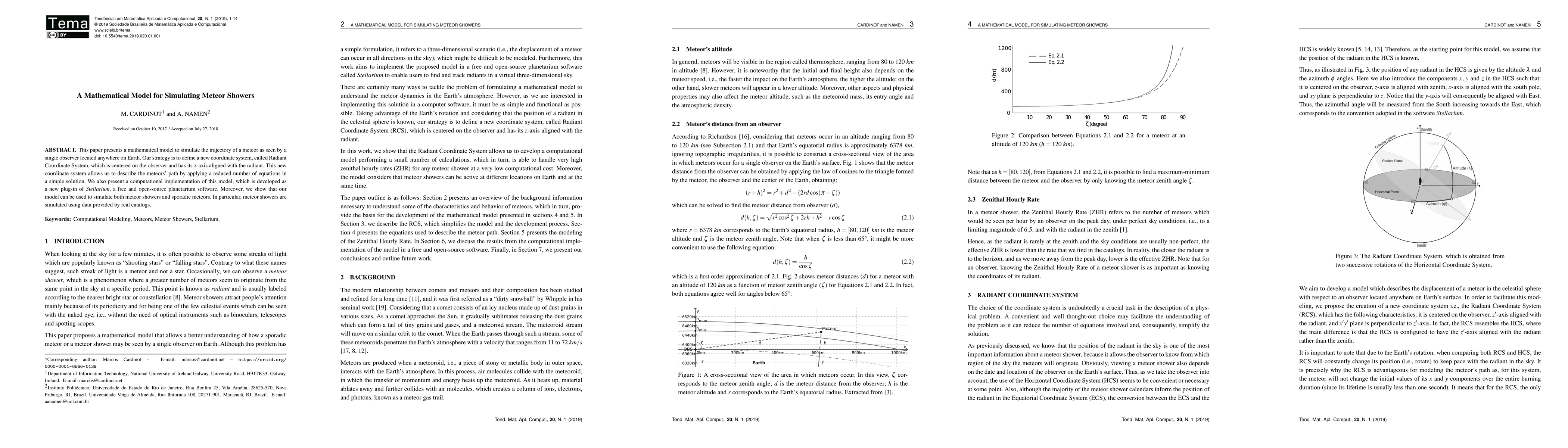 A new mathematical model simulates meteor showers with a reduced number of equations, using a custom Radiant Coordinate System centered on the observer. The model is implemented as a plugin for the free planetarium software Stellarium.