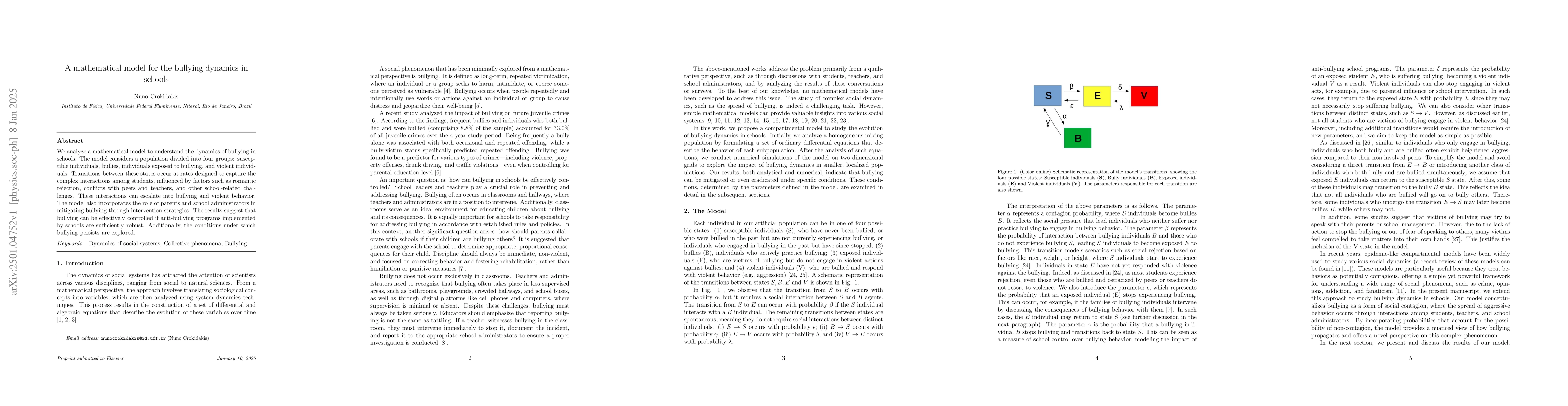 This paper presents a mathematical model to analyze bullying dynamics in schools, categorizing students into susceptible, bullies, exposed, and violent groups. It explores how interactions and school interventions influence transitions and bullying persistence, concluding that robust anti-bullying programs are crucial for effective control.