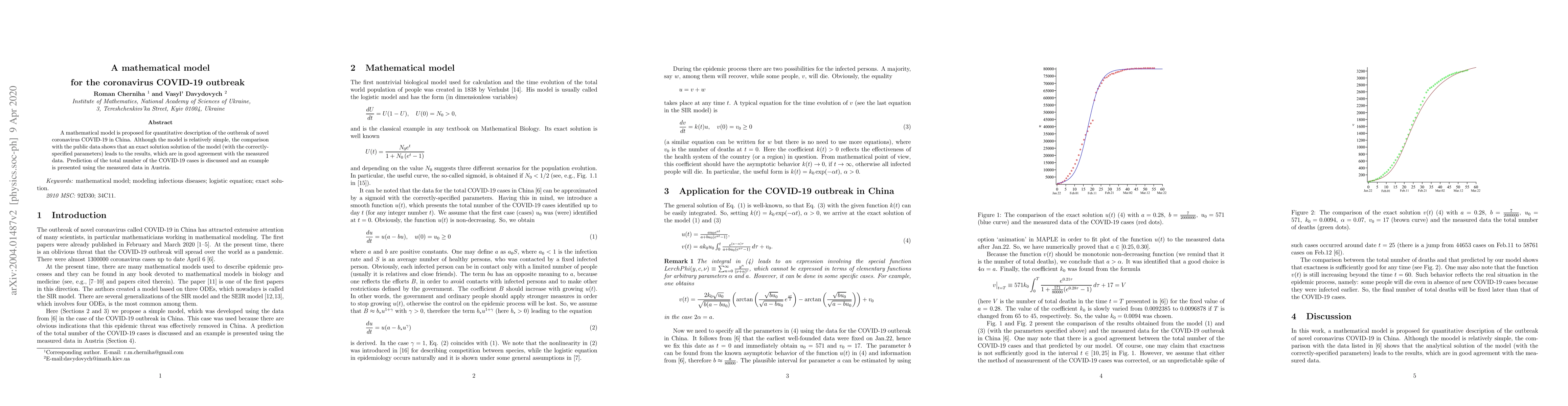 A mathematical model is proposed for quantitative description of the outbreak of novel coronavirus COVID-19 in China. Although the model is relatively simple, the comparison with the public data shows that an exact solution solution of the model (with the correctly-specified parameters) leads to the results, which are in good agreement with the measured data. Prediction of the total number of the COVID-19 cases is discussed and an example is presented using the measured data in Austria.