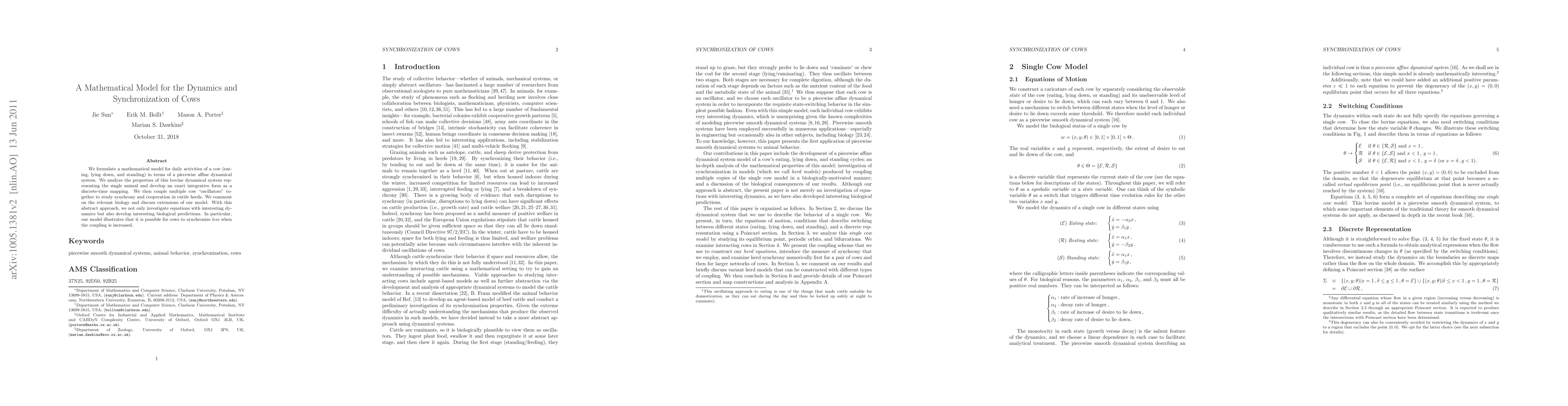 We formulate a mathematical model for daily activities of a cow (eating, lying down, and standing) in terms of a piecewise affine dynamical system. We analyze the properties of this bovine dynamical system representing the single animal and develop an exact integrative form as a discrete-time mapping. We then couple multiple cow "oscillators" together to study synchrony and cooperation in cattle herds. We comment on the relevant biology and discuss extensions of our model. With this abstract approach, we not only investigate equations with interesting dynamics but also develop interesting biological predictions. In particular, our model illustrates that it is possible for cows to synchronize \emph{less} when the coupling is increased.