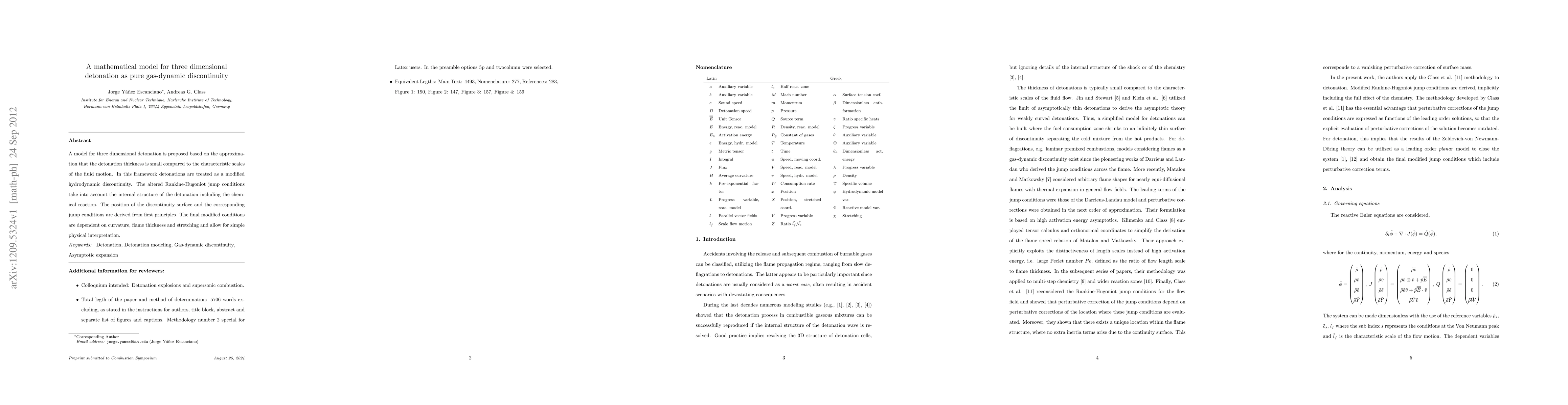 This paper proposes a mathematical model for 3D detonation, treating it as a modified hydrodynamic discontinuity. It derives position and jump condition formulas considering curvature, flame thickness, and stretching, allowing for physical interpretation.
