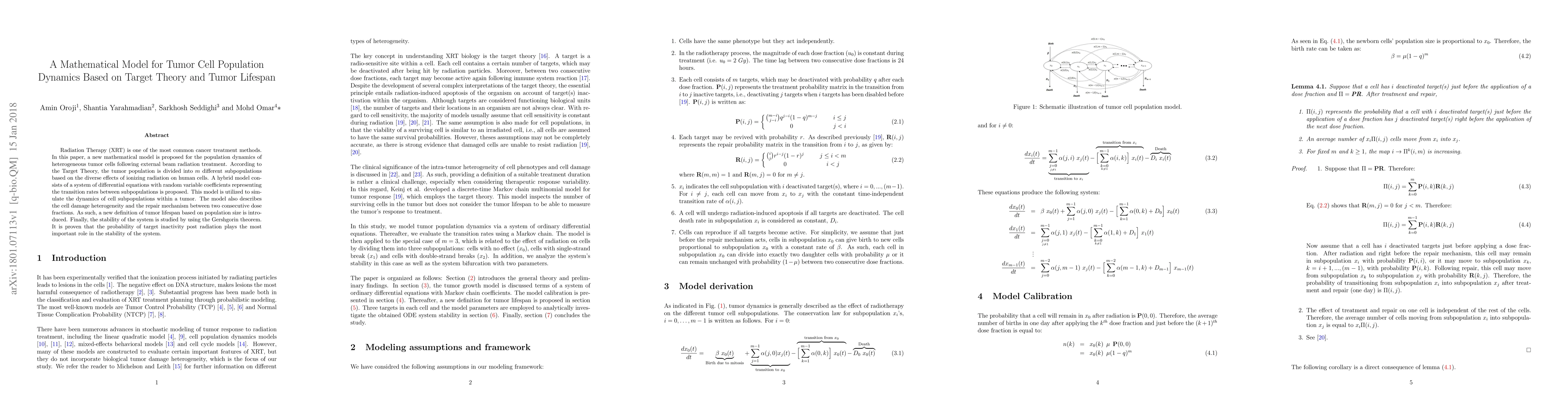 Radiation Therapy (XRT) is one of the most common cancer treatment methods. In this paper, a new mathematical model is proposed for the population dynamics of heterogeneous tumor cells following external beam radiation treatment. According to the Target Theory, the tumor population is divided into m different subpopulations based on the diverse effects of ionizing radiation on human cells. A hybrid model con- sists of a system of differential equations with random variable coefficients representing the transition rates between subpopulations is proposed. This model is utilized to sim- ulate the dynamics of cell subpopulations within a tumor. The model also describes the cell damage heterogeneity and the repair mechanism between two consecutive dose fractions. As such, a new definition of tumor lifespan based on population size is intro- duced. Finally, the stability of the system is studied by using the Gershgorin theorem. It is proven that the probability of target inactivity post radiation plays the most important role in the stability of the system.