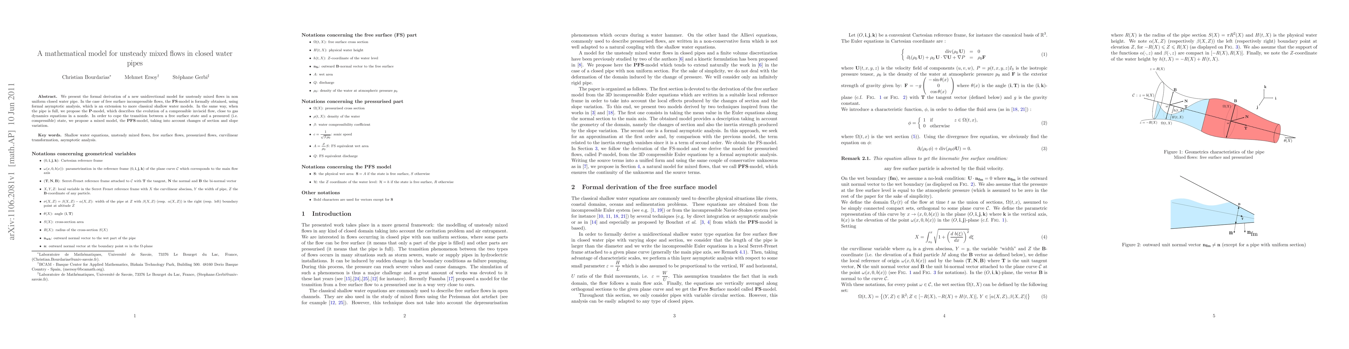 This paper introduces a mathematical model for unsteady mixed flows in non-uniform closed water pipes, deriving separate models for free surface and pressurized flows, and proposing a mixed model to transition between these states. The FS-model extends classical shallow water models, while the Pres-model describes compressible inviscid flow akin to gas dynamics.