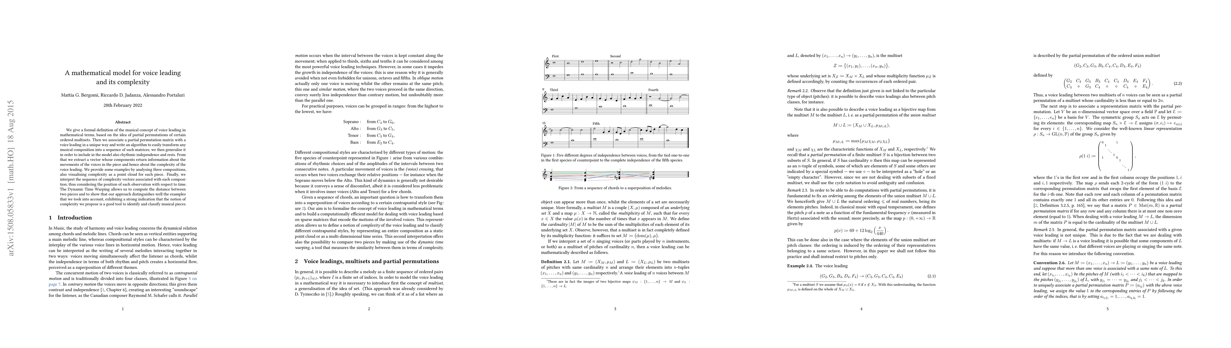 We give a formal definition of the musical concept of voice leading in mathematical terms, based on the idea of partial permutations of certain ordered multisets. Then we associate a partial permutation matrix with a voice leading in a unique way and write an algorithm to easily transform any musical composition into a sequence of such matrices; we then generalise it in order to include in the model also rhythmic independence and rests. From that we extract a vector whose components return information about the movements of the voices in the piece and hence about the complexity of the voice leading. We provide some examples by analysing three compositions, also visualising complexity as a point cloud for each piece. Finally, we interpret the sequence of complexity vectors associated with each composition, thus considering the position of each observation with respect to time. The Dynamic Time Warping allows us to compute the distance between two pieces and to show that our approach distinguishes well the examples that we took into account, exhibiting a strong indication that the notion of complexity we propose is a good tool to identify and classify musical pieces.