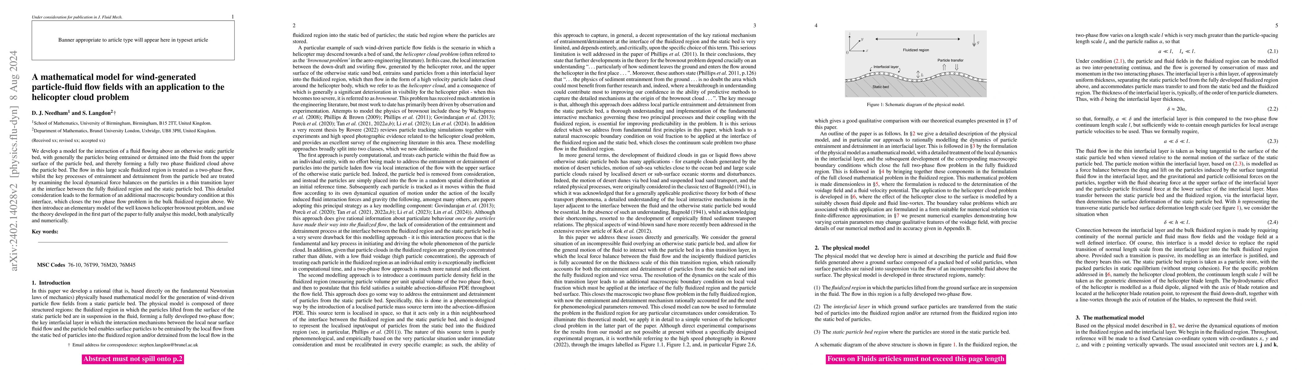 We develop a model for the interaction of a fluid flowing above an otherwise static particle bed, with generally the particles being entrained or detrained into the fluid from the upper surface of the particle bed, and thereby forming a fully two phase fluidized cloud above the particle bed. The flow in this large scale fluidized region is treated as a two-phase flow, whilst the key processes of entrainment and detrainment from the particle bed are treated by examining the local dynamical force balances on the particles in a thin transition layer at the interface between the fully fluidized region and the static particle bed. This detailed consideration leads to the formation of an additional macroscopic boundary condition at this interface, which closes the two phase flow problem in the bulk fluidized region above. We then introduce an elementary model of the well known helicopter brownout problem, and use the theory developed in the first part of the paper to fully analyse this model, both analytically and numerically.