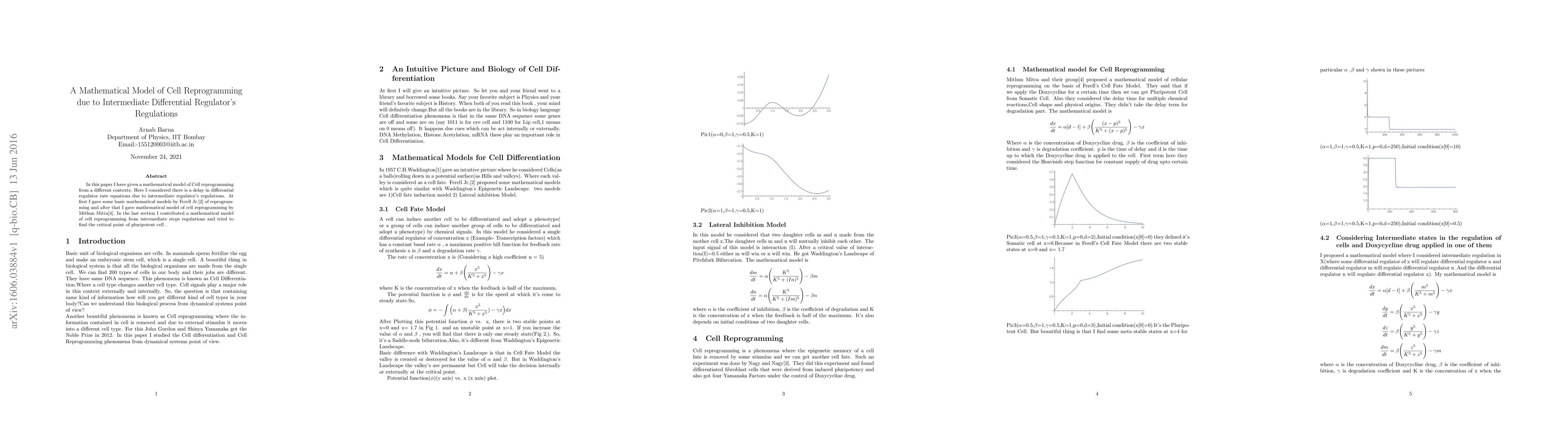 In this paper I have given a mathematical model of Cell reprogramming from a different contexts. Here I considered there is a delay in differential regulator rate equations due to intermediate regulator's regulations. At first I gave some basic mathematical models by Ferell Jr.[2] of reprogramming and after that I gave mathematical model of cell reprogramming by Mithun Mitra[4]. In the last section I contributed a mathematical model of cell reprogramming from intermediate steps regulations and tried to find the critical point of pluripotent cell.