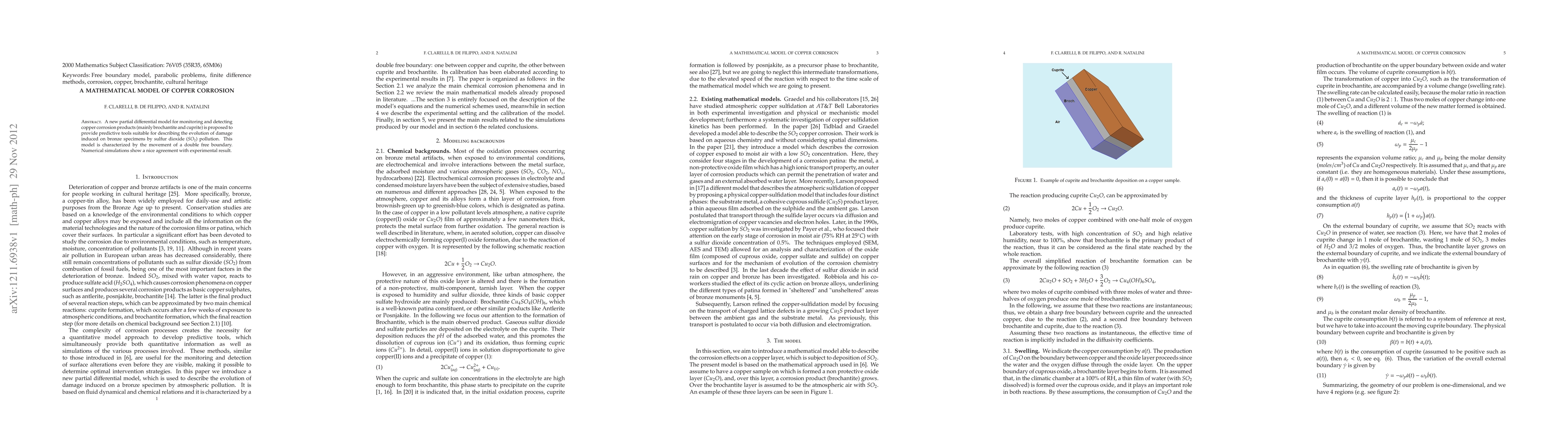 A new partial differential model for monitoring and detecting copper corrosion products (mainly brochantite and cuprite) is proposed to provide predictive tools suitable for describing the evolution of damage induced on bronze specimens by sulfur dioxide (SO_2) pollution. This model is characterized by the movement of a double free boundary. Numerical simulations show a nice agreement with experimental result.