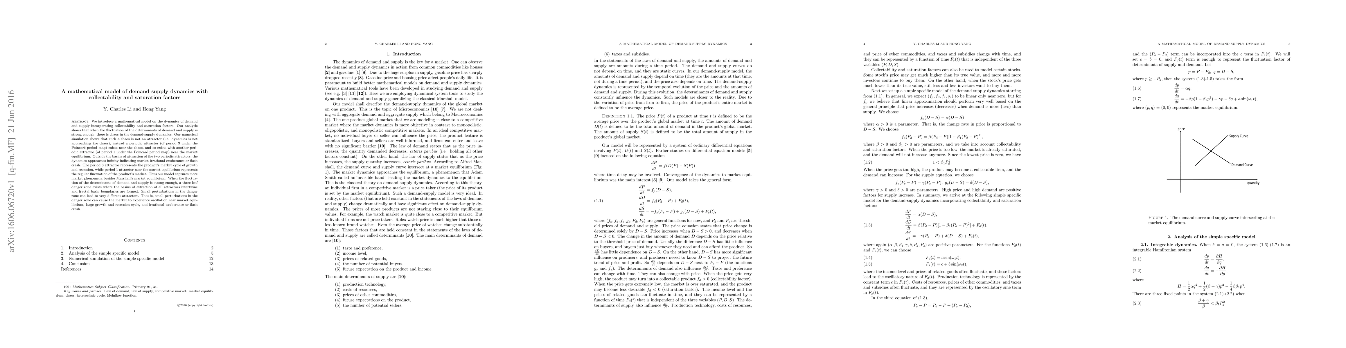 We introduce a mathematical model on the dynamics of demand and supply incorporating collectability and saturation factors. Our analysis shows that when the fluctuation of the determinants of demand and supply is strong enough, there is chaos in the demand-supply dynamics. Our numerical simulation shows that such a chaos is not an attractor (i.e. dynamics is not approaching the chaos), instead a periodic attractor (of period 3 under the Poincar\'e period map) exists near the chaos, and co-exists with another periodic attractor (of period 1 under the Poincar\'e period map) near the market equilibrium. Outside the basins of attraction of the two periodic attractors, the dynamics approaches infinity indicating market irrational exuberance or flash crash. The period 3 attractor represents the product's market cycle of growth and recession, while period 1 attractor near the market equilibrium represents the regular fluctuation of the product's market. Thus our model captures more market phenomena besides Marshall's market equilibrium. When the fluctuation of the determinants of demand and supply is strong enough, a three leaf danger zone exists where the basins of attraction of all attractors intertwine and fractal basin boundaries are formed. Small perturbations in the danger zone can lead to very different attractors. That is, small perturbations in the danger zone can cause the market to experience oscillation near market equilibrium, large growth and recession cycle, and irrational exuberance or flash crash.