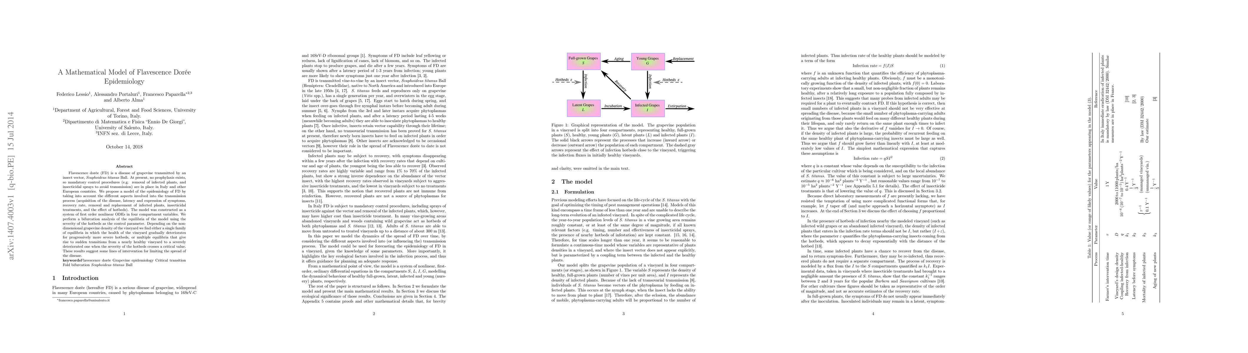 Flavescence dor\'ee (FD) is a disease of grapevine transmitted by an insect vector, $Scaphoideus$ $titanus$ Ball. At present, no prophylaxis exists, so mandatory control procedures (e.g. removal of infected plants, and insecticidal sprays to avoid transmission) are in place in Italy and other European countries. We propose a model of the epidemiology of FD by taking into account the different aspects involved into the transmission process (acquisition of the disease, latency and expression of symptoms, recovery rate, removal and replacement of infected plants, insecticidal treatments, and the effect of hotbeds). The model was constructed as a system of first order nonlinear ODEs in four compartment variables. We perform a bifurcation analysis of the equilibria of the model using the severity of the hotbeds as the control parameter. Depending on the non-dimensional grapevine density of the vineyard we find either a single family of equilibria in which the health of the vineyard gradually deteriorates for progressively more severe hotbeds, or multiple equilibria that give rise to sudden transitions from a nearly healthy vineyard to a severely deteriorated one when the severity of the hotbeds crosses a critical value. These results suggest some lines of intervention for limiting the spread of the disease.