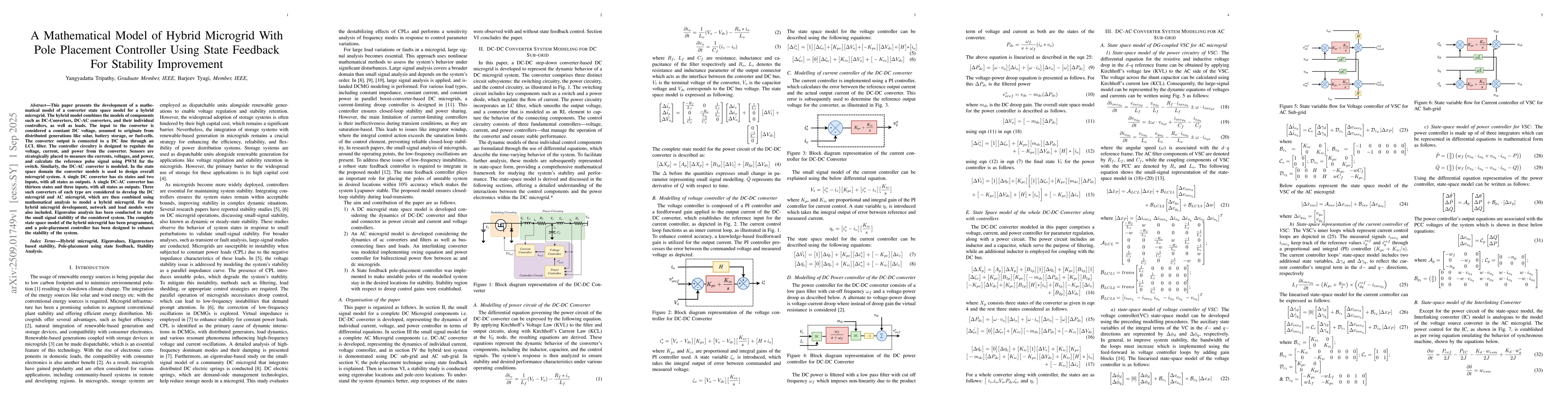 This paper presents the development of a mathematical model of a converter state space model for a hybrid microgrid. The hybrid model combines the models of components such as DC-Converters, DC-AC converters, and their individual controllers, as well as loads. The input to the converter is considered a constant DC voltage, assumed to originate from distributed generations like solar, battery storage, or fuel-cells. The converter output is connected to a DC line through an LCL filter. The controller circuitry is designed to regulate the voltage, current, and power from the converter. Sensors are strategically placed to measure the currents, voltages, and power, and calculate the reference pulse signal using PWM for the switch. Similarly, the DC-AC converter is modeled. In the state space domain the converter models is used to design overall microgrid system. A single DC converter has six states and two inputs, with all states as outputs. A single DC-AC converter has thirteen states and three inputs, with all states as outputs. Three such converters of each type are considered to develop the DC microgrid and AC microgrid, which are then combined using mathematical analysis to model a hybrid microgrid. For the hybrid microgrid development, network and load models were also included. Eigenvalue analysis has been conducted to study the small signal stability of the considered system. The complete state space model of the hybrid microgrid has been programmed, and a pole-placement controller has been designed to enhance the stability of the system.