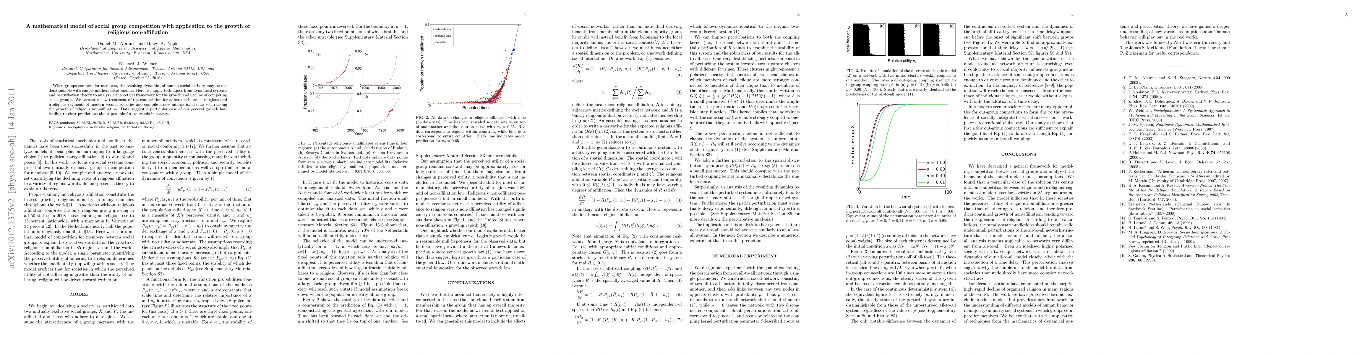 This paper develops a mathematical model using dynamical systems and perturbation theory to analyze the competition between religious and non-religious groups, applying it to the growth of religious non-affiliation. The study compiles international data to validate the model, predicting future trends in societal secularization.