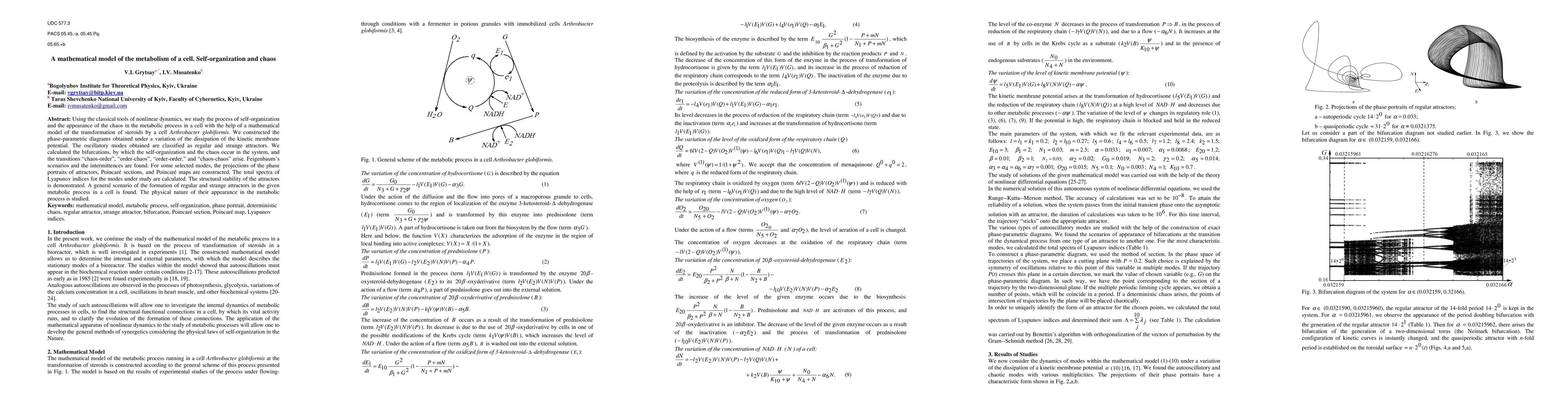 Using the classical tools of nonlinear dynamics, we study the process of self-organization and the appearance of the chaos in the metabolic process in a cell with the help of a mathematical model of the transformation of steroids by a cell Arthrobacter globiformis. We constructed the phase-parametric diagrams obtained under a variation of the dissipation of the kinetic membrane potential. The oscillatory modes obtained are classified as regular and strange attractors. We calculated the bifurcations, by which the self-organization and the chaos occur in the system, and the transitions "chaos-order", "order-chaos", "order-order", and "chaos-chaos" arise. Feigenbaum's scenarios and the intermittences are found. For some selected modes, the projections of the phase portraits of attractors, Poincar\'e sections, and Poincar\'e maps are constructed. The total spectra of Lyapunov indices for the modes under study are calculated. The structural stability of the attractors is demonstrated. A general scenario of the formation of regular and strange attractors in the given metabolic process in a cell is found. The physical nature of their appearance in the metabolic process is studied.
