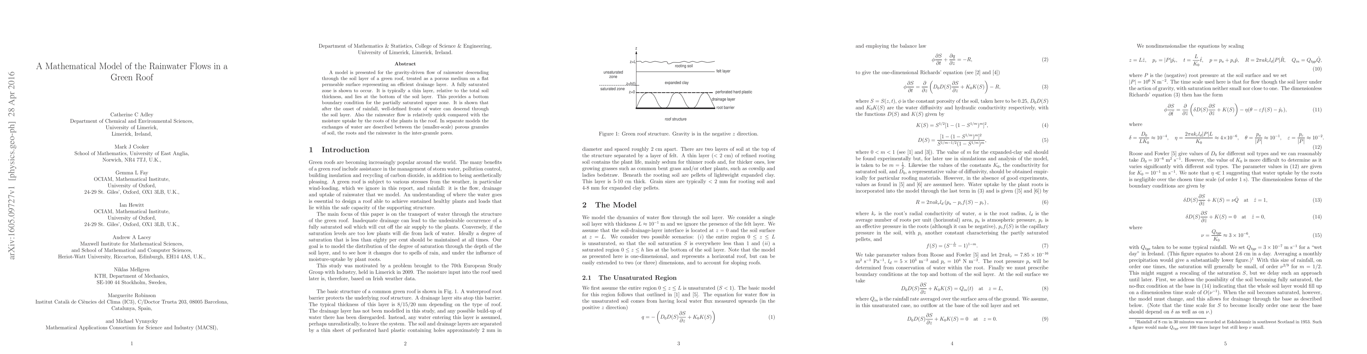 A model is presented for the gravity-driven flow of rainwater descending through the soil layer of a green roof, treated as a porous medium on a flat permeable surface representing an efficient drainage layer. A fully saturated zone is shown to occur. It is typically a thin layer, relative to the total soil thickness, and lies at the bottom of the soil layer. This provides a bottom boundary condition for the partially saturated upper zone. It is shown that after the onset of rainfall, well-defined fronts of water can descend through the soil layer. Also the rainwater flow is relatively quick compared with the moisture uptake by the roots of the plants in the roof. In separate models the exchanges of water are described between the (smaller-scale) porous granules of soil, the roots and the rainwater in the inter-granule pores.