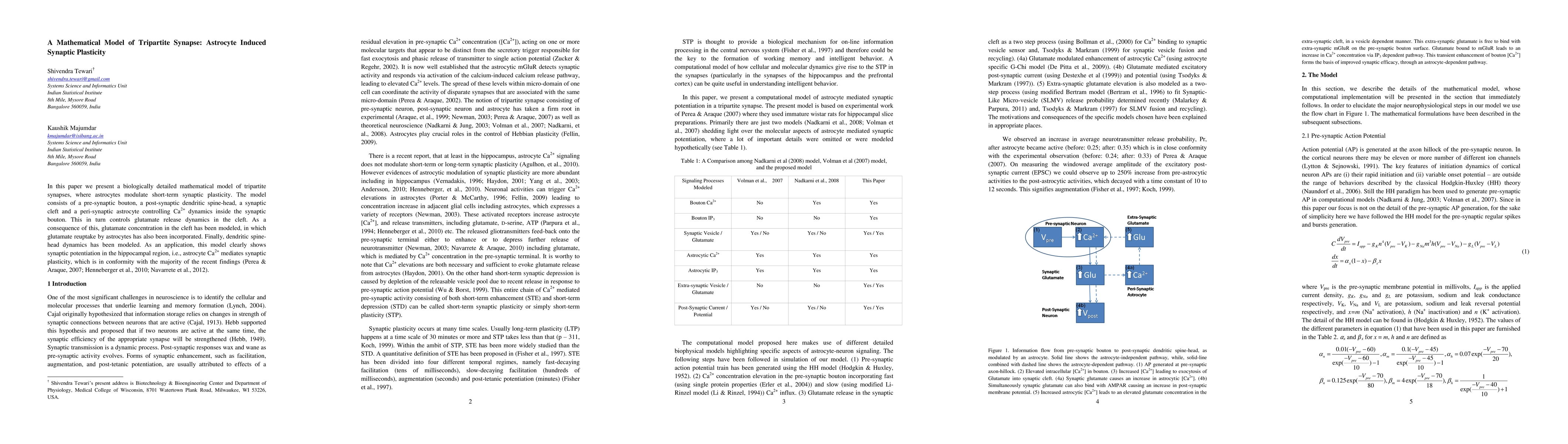 This paper develops a detailed mathematical model of tripartite synapses, focusing on how astrocytes modulate short-term synaptic plasticity through calcium dynamics and glutamate release. The model demonstrates astrocyte-mediated synaptic potentiation in the hippocampus, aligning with recent findings.
