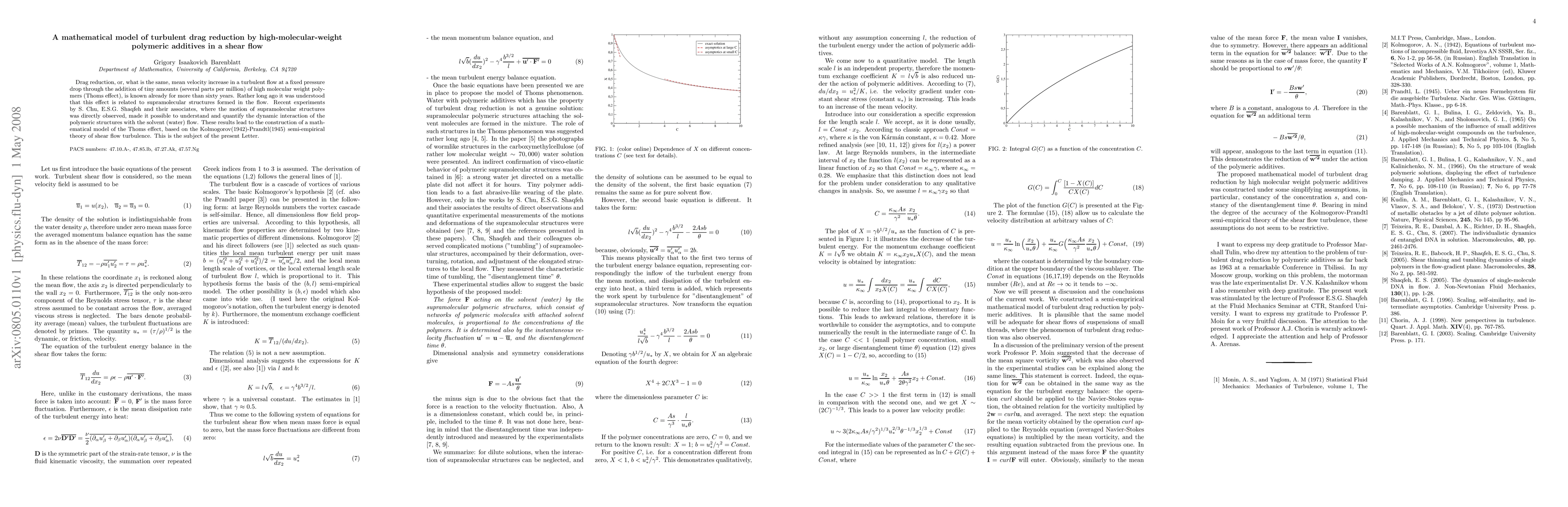 Drag reduction, or, what is the same, mean velocity increase in a turbulent flow at a fixed pressure drop through the addition of tiny amounts (several parts per million) of high molecular weight polymers (Thoms effect), is known already for more than sixty years. Rather long ago it was understood that this effect is related to supramolecular structures formed in the flow. Recent experiments by S. Chu, E.S.G. Shaqfeh and their associates, where the motion of supramolecular structures was directly observed, made it possible to understand and quantify the dynamic interaction of the polymeric structures with the solvent (water) flow. These results lead to the construction of a mathematical model of the Thoms effect, based on the Kolmogorov(1942)-Prandtl(1945) semi-empirical theory of shear flow turbulence.