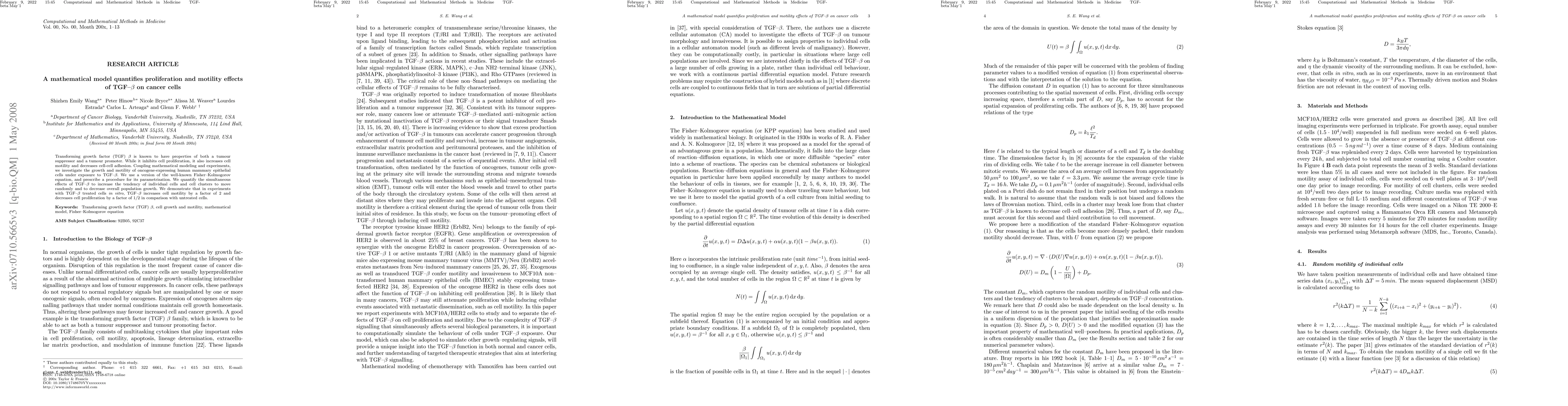 Transforming growth factor (TGF) $\beta$ is known to have properties of both a tumor suppressor and a tumor promoter. While it inhibits cell proliferation, it also increases cell motility and decreases cell--cell adhesion. Coupling mathematical modeling and experiments, we investigate the growth and motility of oncogene--expressing human mammary epithelial cells under exposure to TGF--$\beta$. We use a version of the well--known Fisher--Kolmogorov equation, and prescribe a procedure for its parametrization. We quantify the simultaneous effects of TGF--$\beta$ to increase the tendency of individual cells and cell clusters to move randomly and to decrease overall population growth. We demonstrate that in experiments with TGF--$\beta$ treated cells \textit{in vitro}, TGF--$\beta$ increases cell motility by a factor of 2 and decreases cell proliferation by a factor of 1/2 in comparison with untreated cells.