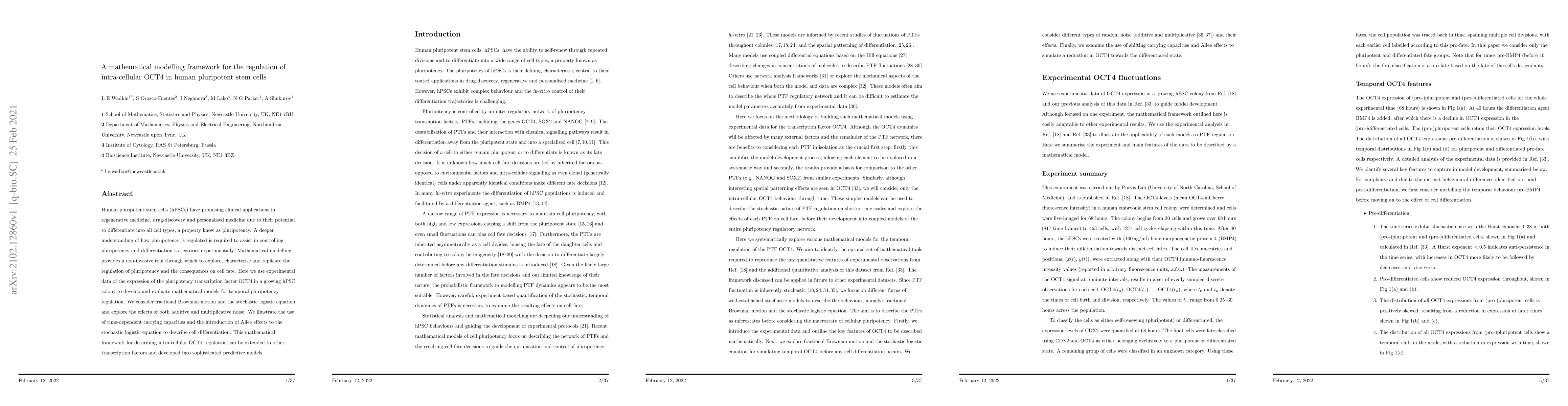 Human pluripotent stem cells (hPSCs) have promising clinical applications in regenerative medicine, drug-discovery and personalised medicine due to their potential to differentiate into all cell types, a property know as pluripotency. A deeper understanding of how pluripotency is regulated is required to assist in controlling pluripotency and differentiation trajectories experimentally. Mathematical modelling provides a non-invasive tool through which to explore, characterise and replicate the regulation of pluripotency and the consequences on cell fate. Here we use experimental data of the expression of the pluripotency transcription factor OCT4 in a growing hPSC colony to develop and evaluate mathematical models for temporal pluripotency regulation. We consider fractional Brownian motion and the stochastic logistic equation and explore the effects of both additive and multiplicative noise. We illustrate the use of time-dependent carrying capacities and the introduction of Allee effects to the stochastic logistic equation to describe cell differentiation. This mathematical framework for describing intra-cellular OCT4 regulation can be extended to other transcription factors and developed into sophisticated predictive models.
