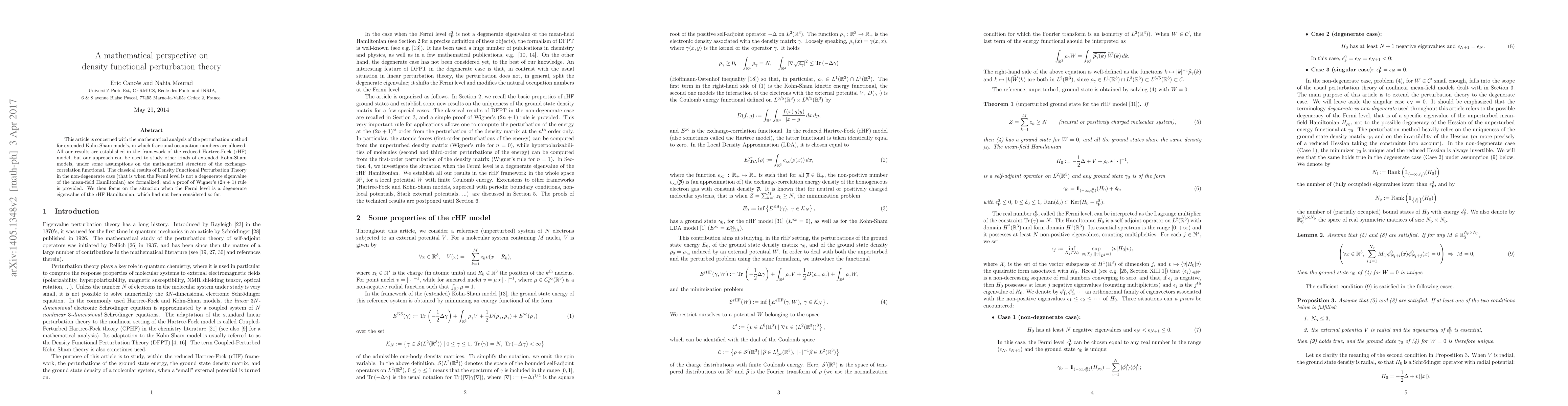 The paper presents a rigorous mathematical analysis of perturbation theory for extended Kohn-Sham models, extending Wigner's rule to degenerate cases and providing a systematic method for constructing perturbation coefficients.