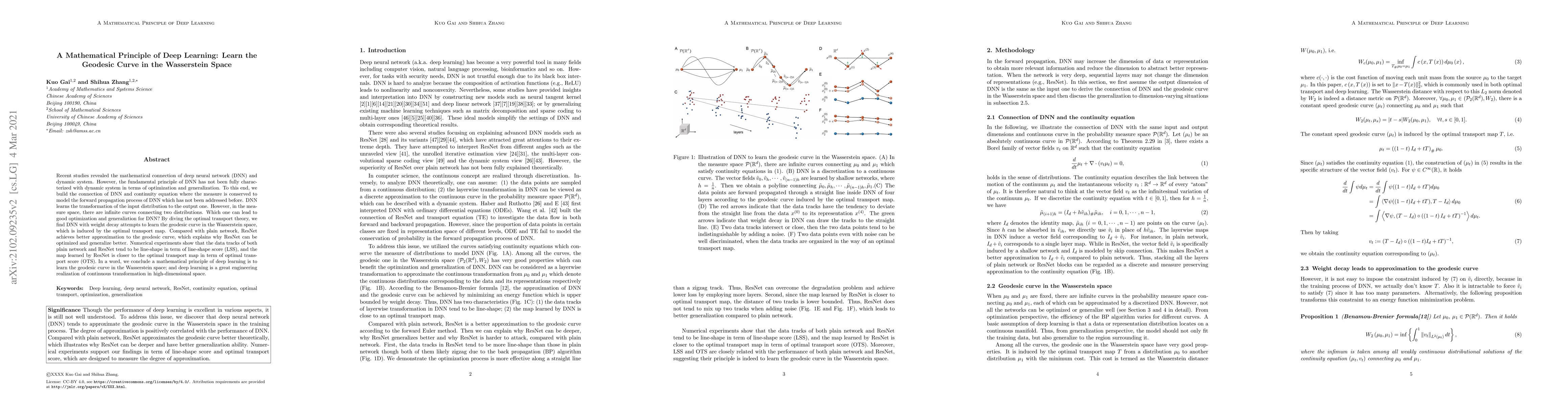 This paper establishes a mathematical principle linking deep learning to the geodesic curve in the Wasserstein space, demonstrating that deep neural networks (DNN) learn transformations between input and output distributions. It shows that DNNs with weight decay aim to learn the geodesic curve, which optimizes both optimization and generalization, with ResNets better approximating this curve than plain networks.