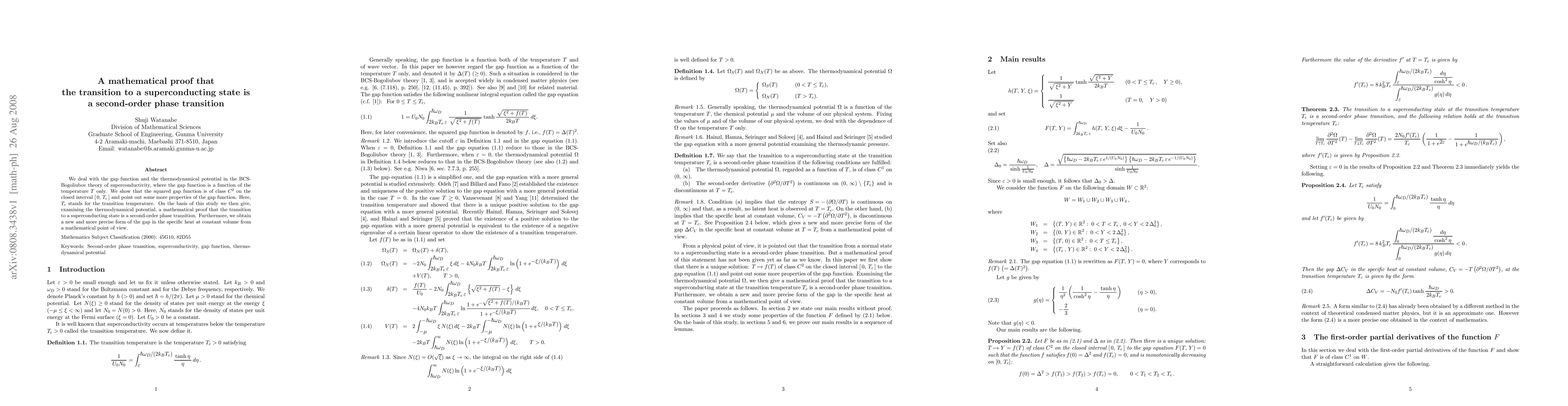 We deal with the gap function and the thermodynamical potential in the BCS-Bogoliubov theory of superconductivity, where the gap function is a function of the temperature $T$ only. We show that the squared gap function is of class $C^2$ on the closed interval $[ 0, T_c ]$ and point out some more properties of the gap function. Here, $T_c$ stands for the transition temperature. On the basis of this study we then give, examining the thermodynamical potential, a mathematical proof that the transition to a superconducting state is a second-order phase transition. Furthermore, we obtain a new and more precise form of the gap in the specific heat at constant volume from a mathematical point of view.