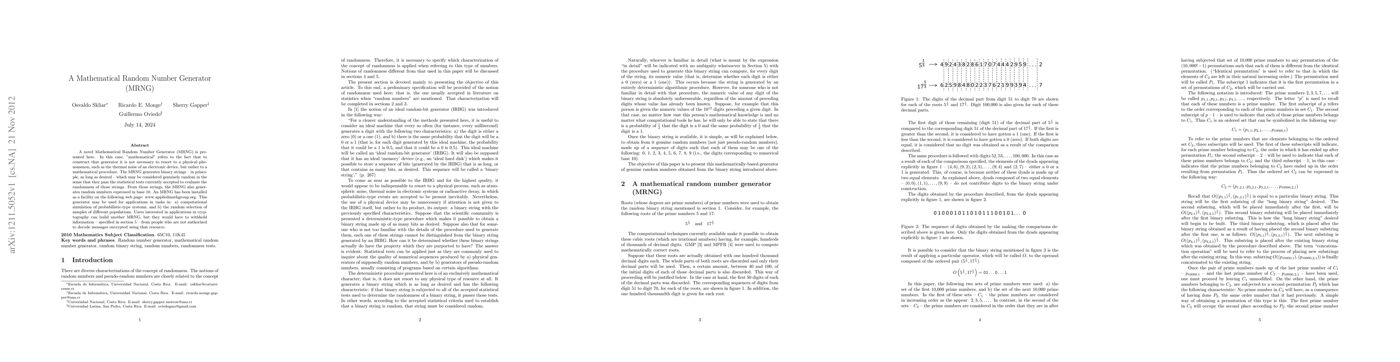 A new mathematical random number generator (MRNG) produces binary strings considered genuinely random and generates base 10 numbers for various applications, including simulation and sampling.